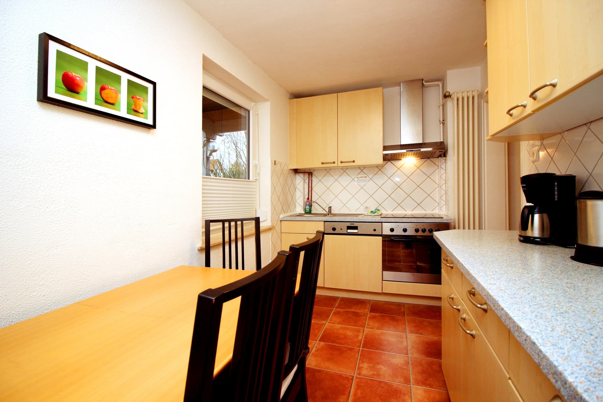 Die Küche ist komplett eingerichtet (Einbaumöbel, Essplatz, Spülmaschine, Kühlschrank mit Gefrierfach, Mikrowelle, Wasserkocher, Toaster, E-Herd mit Ceranfeld, Geschirr, Kaffeemaschine).