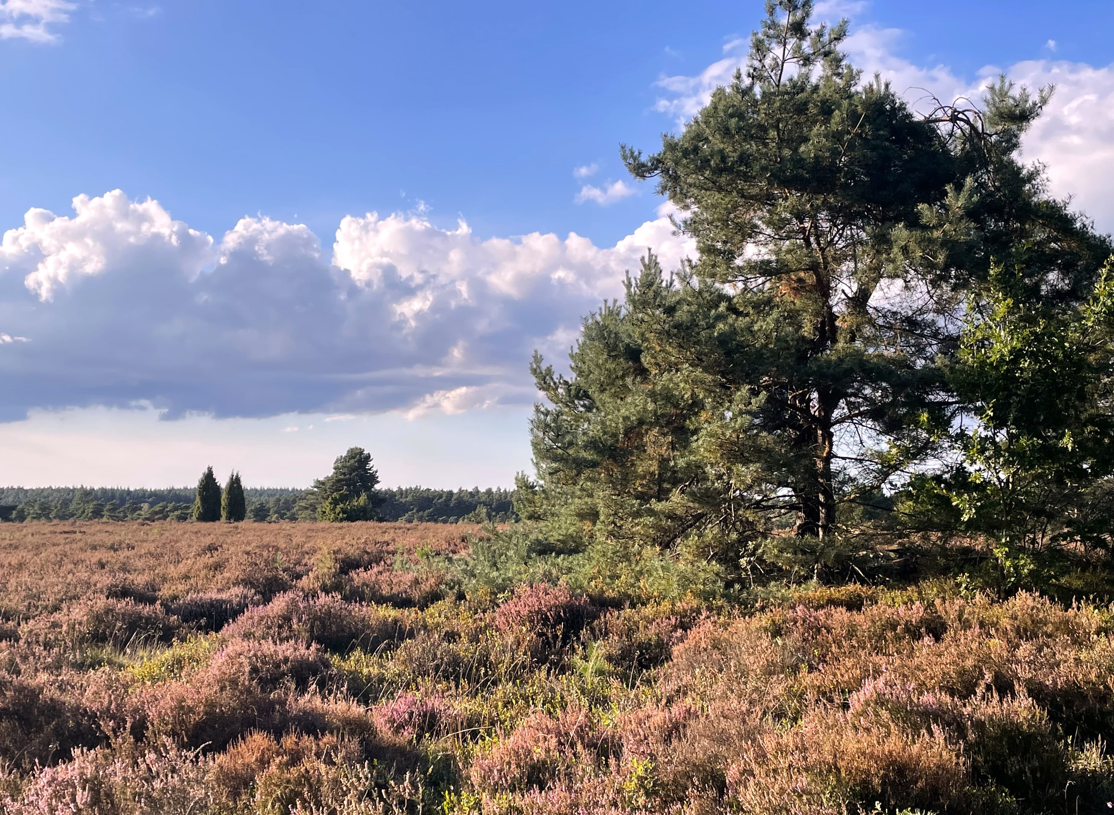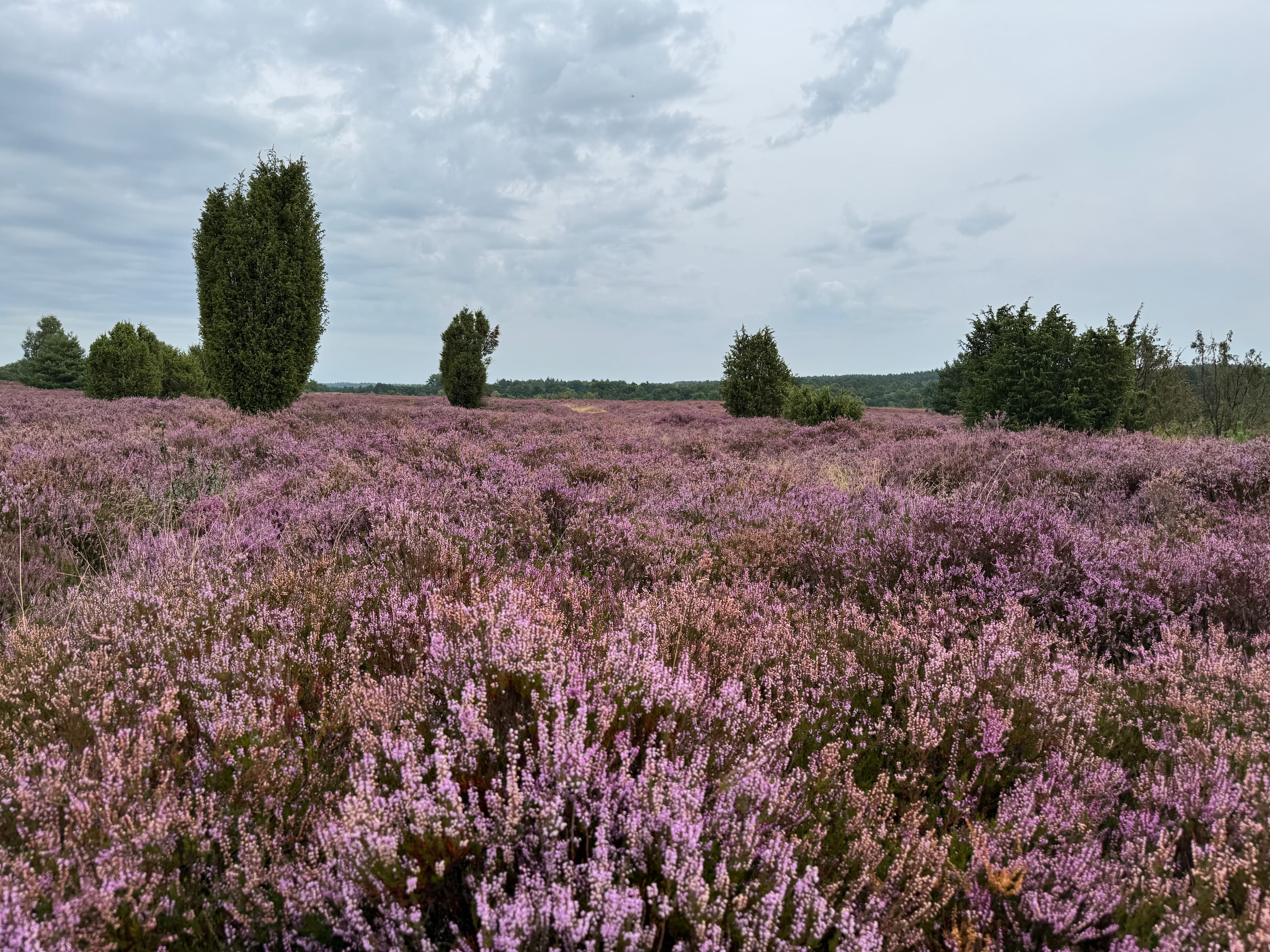 Schön anzusehen ist es aktuell im Landschaftsschutzgebiet Höpen, im geschützten Steingrund sowie im Wacholderwald Schmarbeck. Dort leuchtet die Heide stellenweise noch in sanftem Violett.