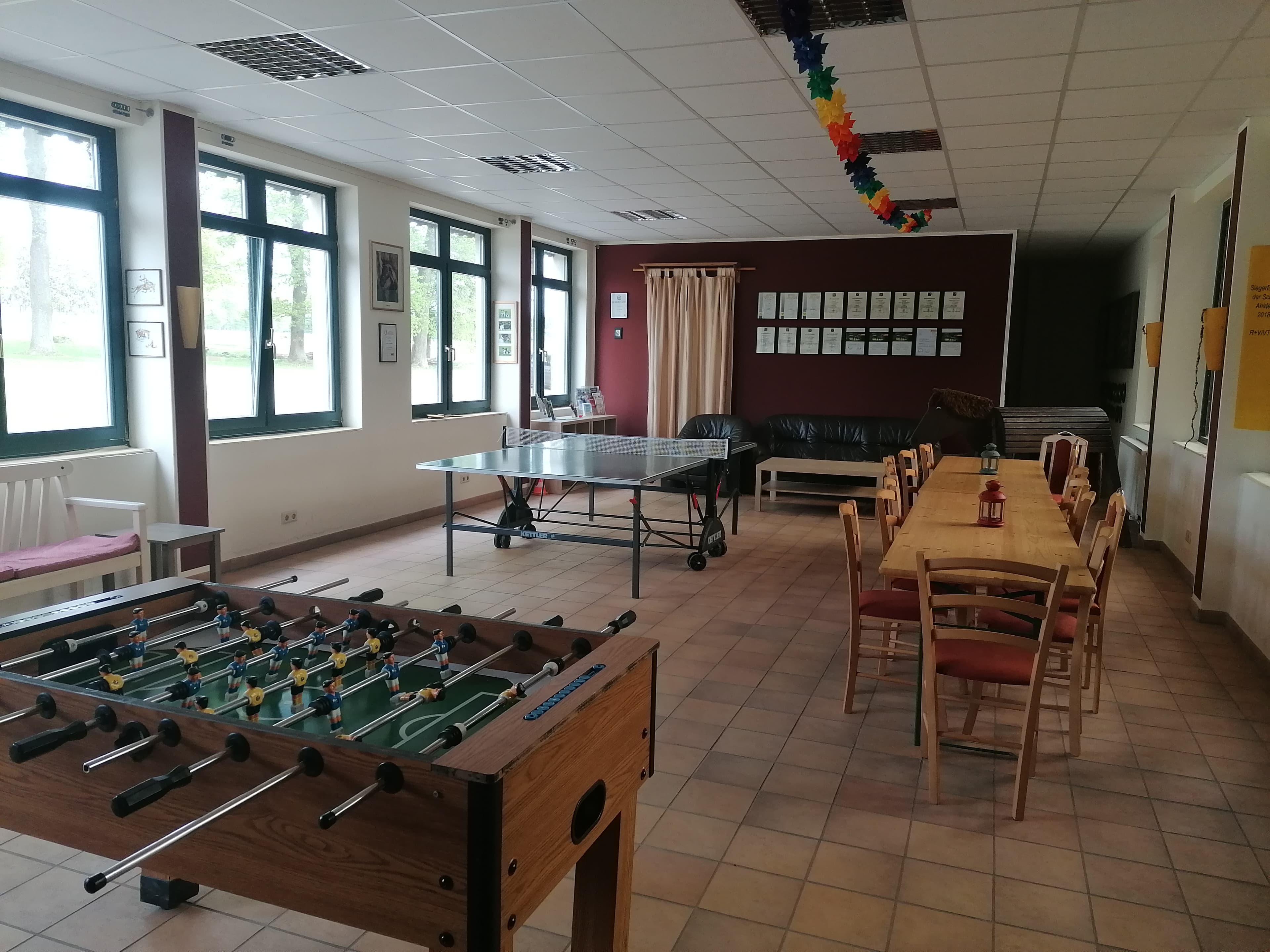 Im Zuschauerraum der Reithalle befindet sich eine Tischtennisplatte sowie ein Kickertisch.