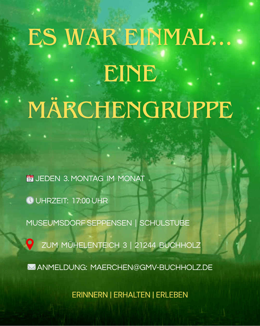 Buchholz in der NordheideAb demEinladung zur neuen Märchengruppe im GMV. Märchenerzählen ist immaterielles UNESCO-Welterbe - und genau dieser faszinierenden Erzähltradition widmet sich Susanne Scheel mit ihrer neuen Märchengruppe. Was wartet auf Euch? - Märchen aus alter Zeit und aus aller Welt - Spannende Einblicke in Symbolik …