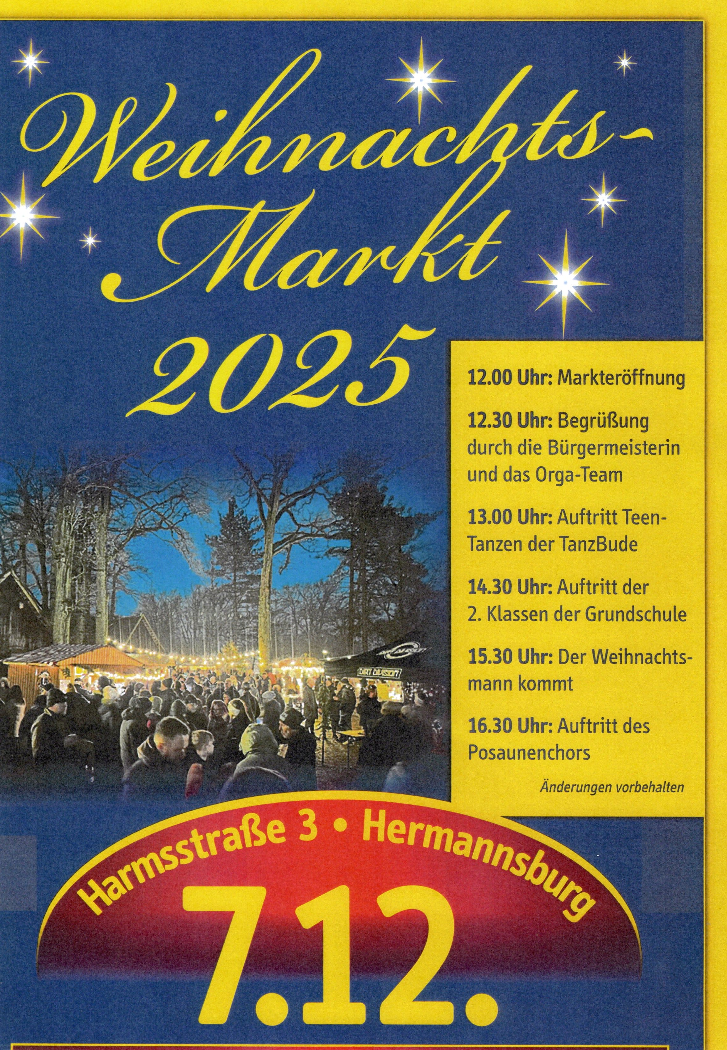 Hermannsburg-Zweiter Adventssonntag 7. Dezember von 12:00 bis 18:00 Uhr Besinnliche Atmosphäre und ein buntes Rahmenprogramm warten auf Sie! Der Weihnachtsmarkt findet auch in diesem Jahr wieder auf dem Gelände des Heimatmuseums statt. Die Veranstalter freuen sich, Sie in gemütlicher weihnachtlicher Atmosphäre…