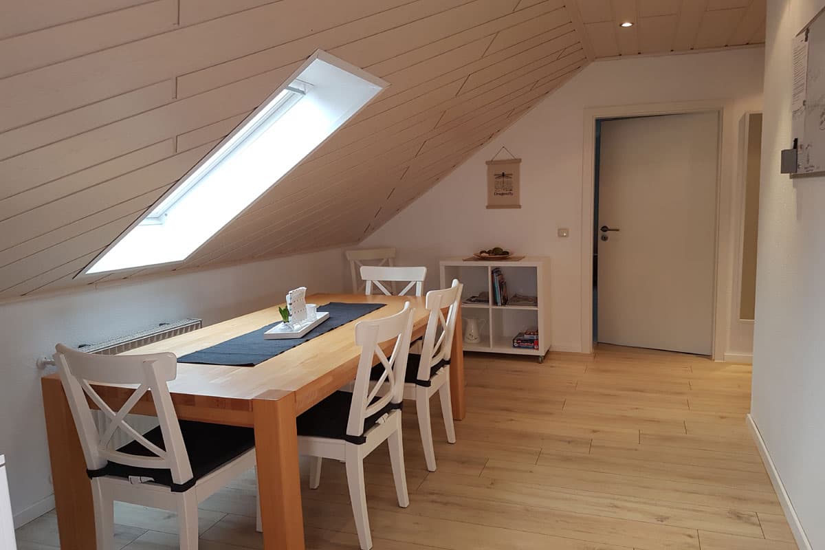 Unsere Ferienwohnung mit 3 Schlafzimmern befindet sich im Dachgeschoß unseres Einzelhauses. Dieses befindet sich in ruhiger Lage in Waldnähe.