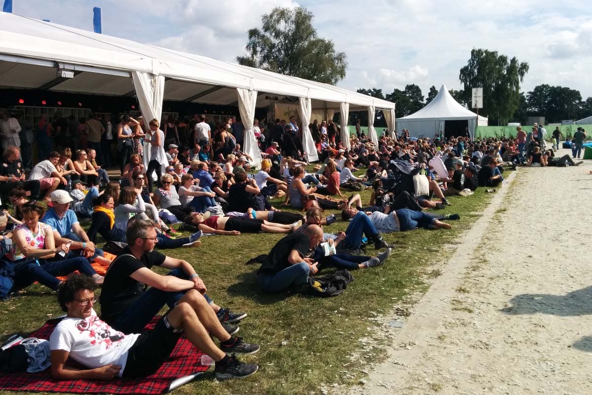 Dass die Festivalmacher auf einen sparsamen Umgang mit Ressourcen geachtet haben, das spürt man hier an jeder Ecke. Auch bei der Essensauswahl müssen keine Sünden begangen werden: Zur Auswahl stehen vegetarische Ofenkartoffel mit Keimlingen und Kräuterpesto, Bio-Grillwürstchen vom Bauckhof, Lachsdöner und viele andere Köstlichkeiten.
