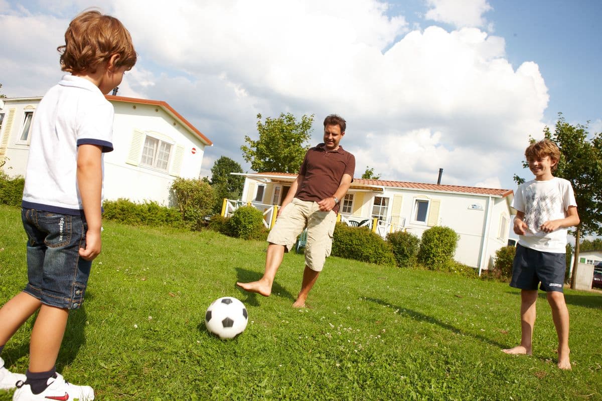 an Hindernissen vorbei spielen, um am Ende jeder Bahn einzulochen. Fußballgolf am Weltvogel Park Walsrode.