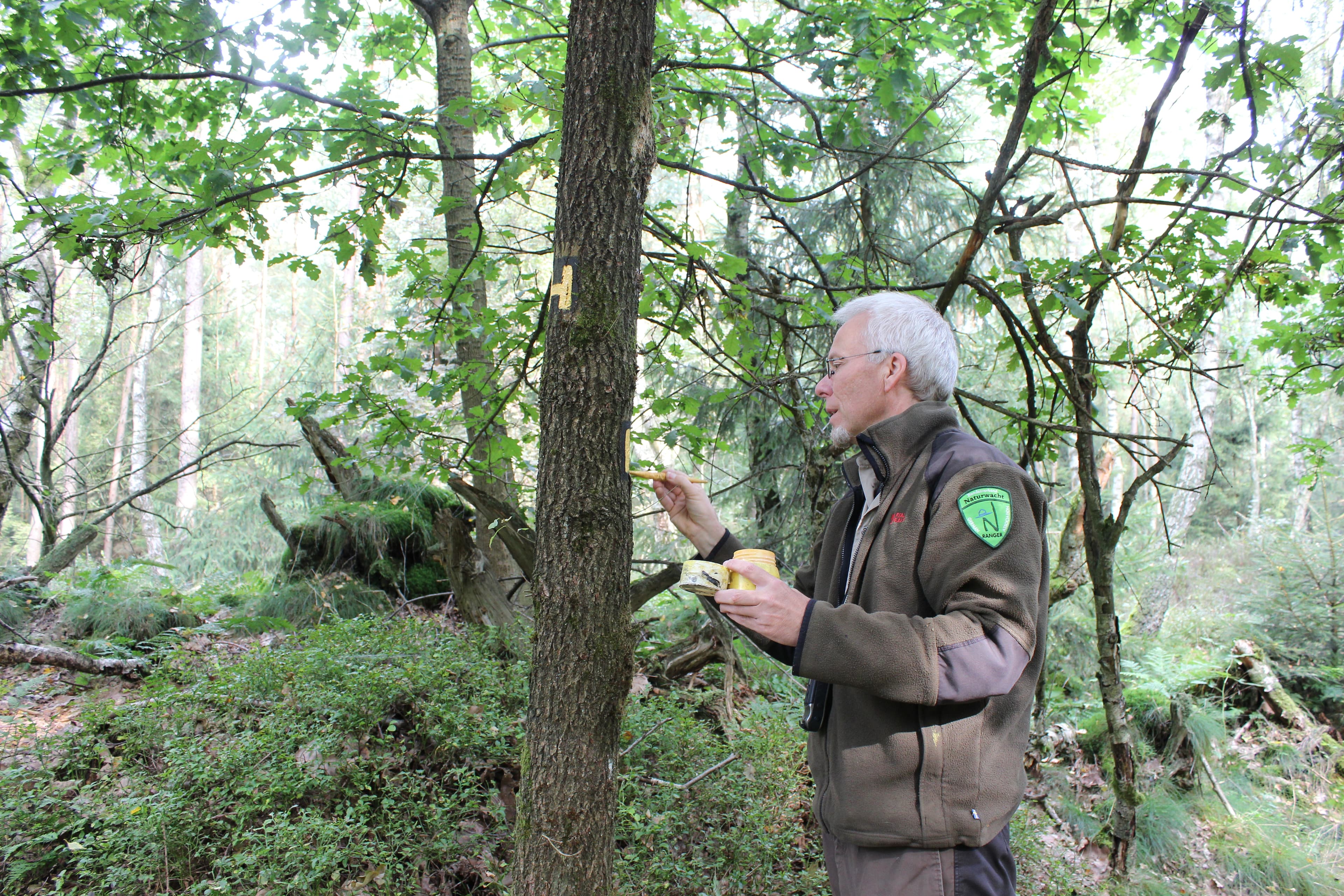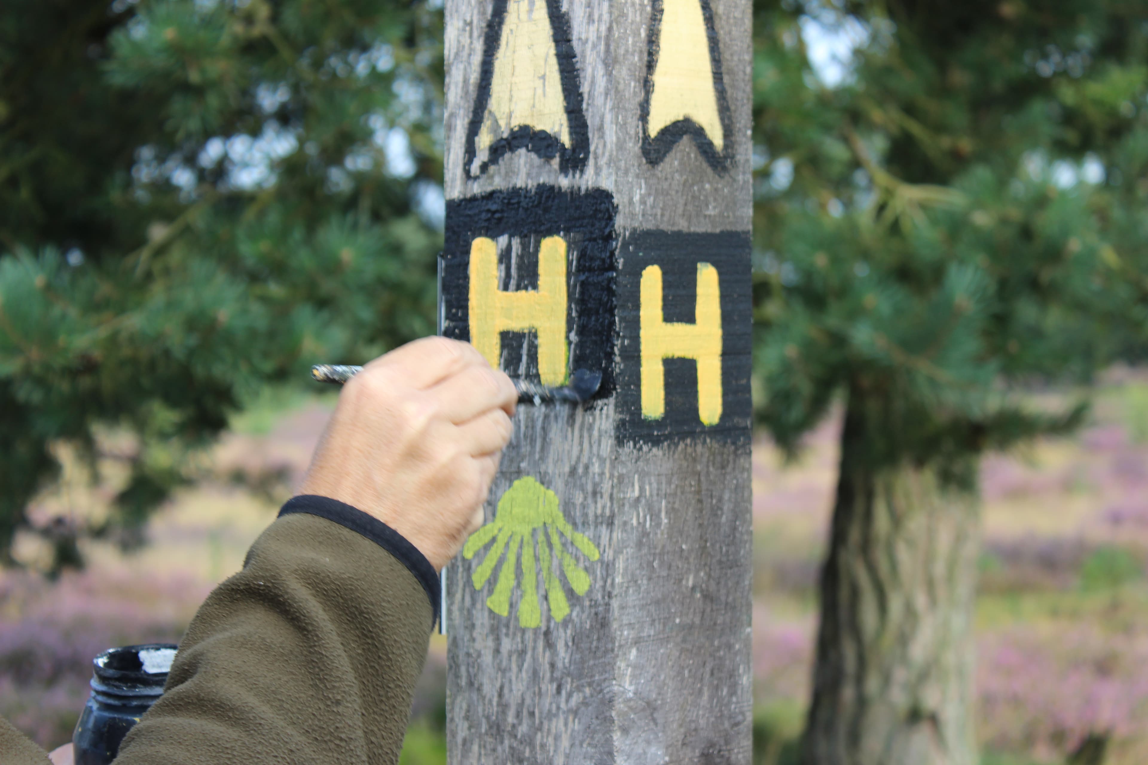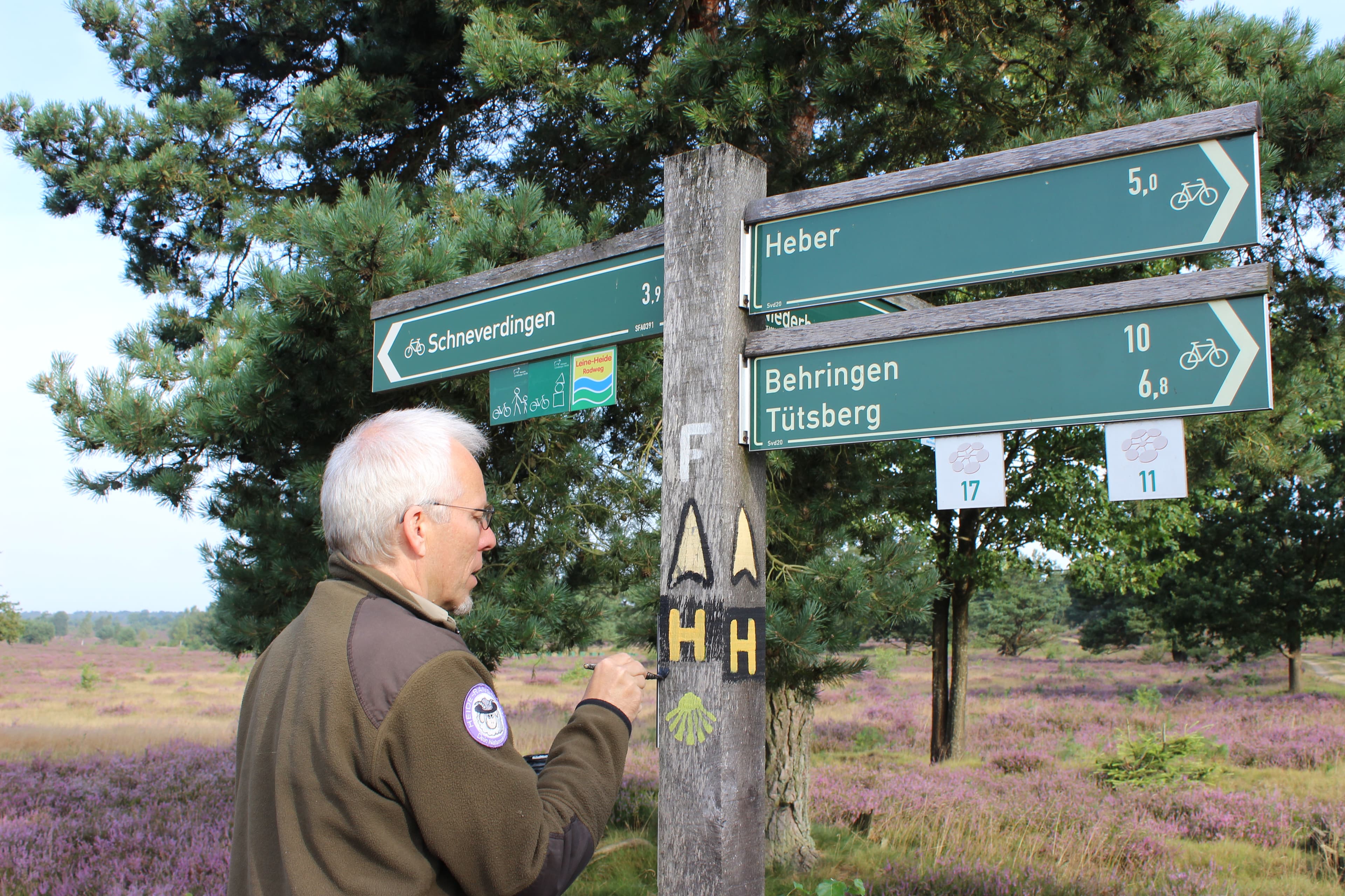 Wer den Ranger für einen Tag begleitet, der muss mit anpacken. Und so machen wir uns nun an die Ausbesserung der Beschilderung des Heidschnuckenwegs. Der Heidschnuckenweg ist ein vom Deutschen Wanderverband zum Qualitätsweg ausgezeichneter Fernwanderweg von Hamburg-Fischbek bis Celle. Jan Brockmann ist für die Kontrolle des Weges zuständig. Zweimal jährlich kontrolliert er, ob Hindernisse den Weg versperren und ob die Beschilderung noch einwandfrei ist. Diverse „H“s müssen ausgebessert werden. Am Hauptweg zeigt ein weißes H auf schwarzem Grund dem Wanderer die Richtung an. „Alle 350 Meter sollte ein Wohlfühl-H kommen“, weiß Jan Brockmann. „Damit der Wanderer auch bei geraden Streckenabschnitten versichert ist, auf dem richtigen Weg zu sein“. Mit dem Geländewagen geht es weiter zur nächsten Station. „Der hat eine Sondergenehmigung, sonst dürfte er im autofreien Naturschutzgebiet gar nicht unterwegs sein“, erklärt der Ranger.