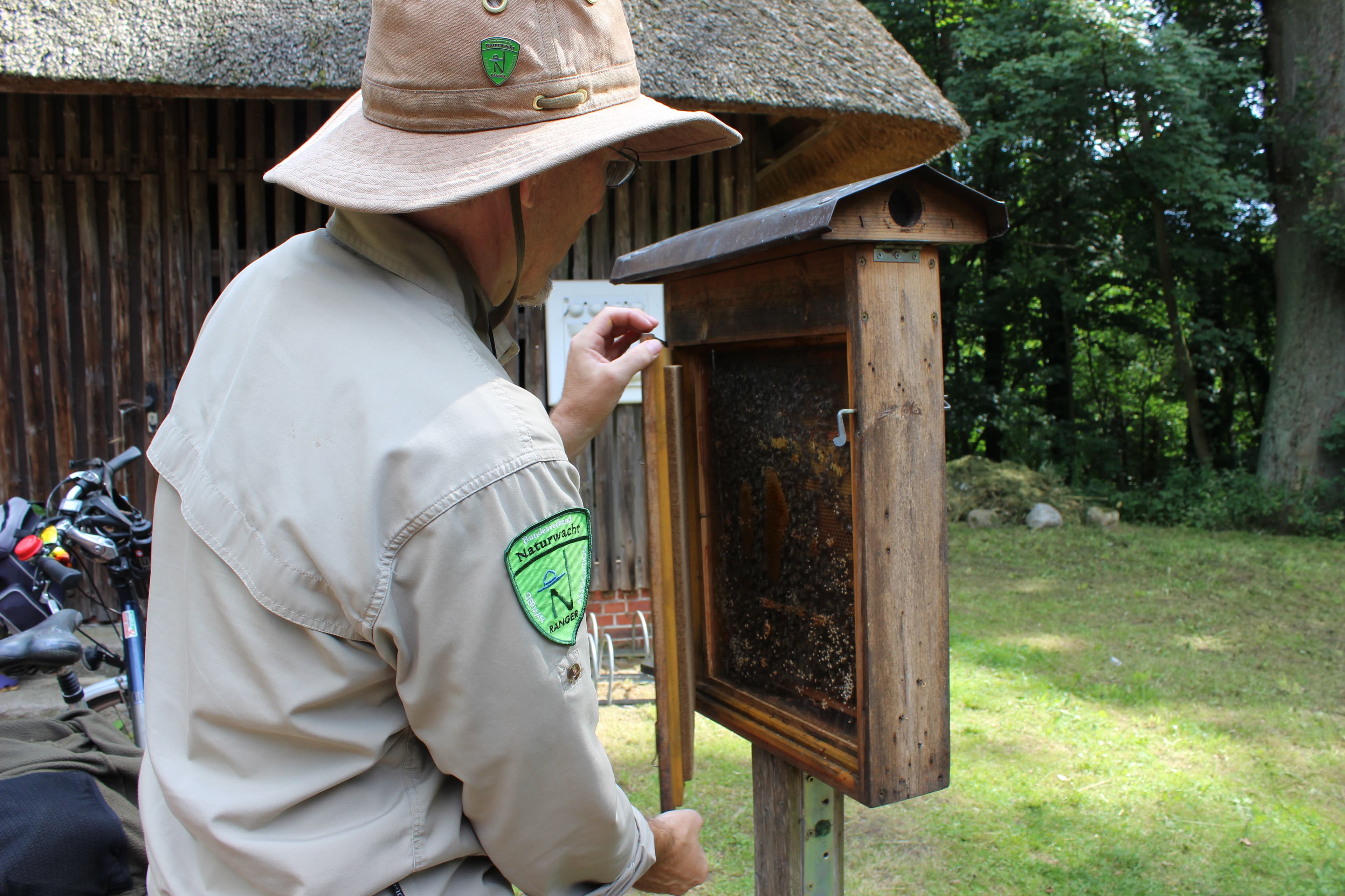 Naturinteressierten Einzelpersonen oder Gruppen bei Landschaftsführungen die Besonderheiten der Heide näherzubringen, ist eine der wichtigsten Aufgaben eines Rangers. Jan Brockmann versteht sich als Vermittler zwischen Mensch und Natur. Das macht er sogar so gut, dass ihm eine Gruppe zum Dank nach einer Führung eine Bank gestiftet hat. Das kann man beim Verein Naturschutzpark machen. „Sie steht im Steingrund bei Wilsede“, erzählt Herr Brockmann.
