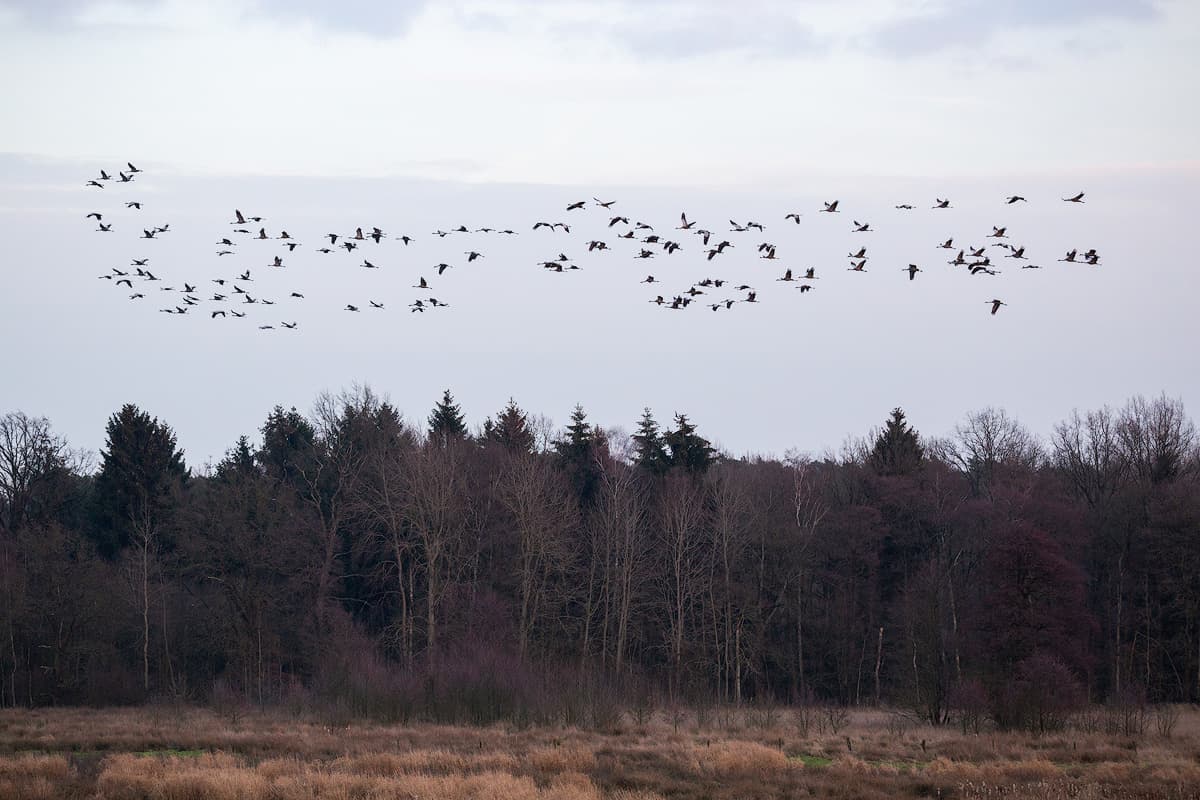 Die Rufe der Kraniche hört man oft in der Lüneburger Heide und zur Zeit des Vogelzugs sieht man tausende über der Region kreisen. Viele Kraniche bleiben auch den Winter in der Heide. Da sie sehr scheu sind, sieht man sie meistens im Flug. Doch auch von den Aussichtsplattformen in den Mooren hat man ab und zu Glück.Tipps, um Kraniche zu beobachten: