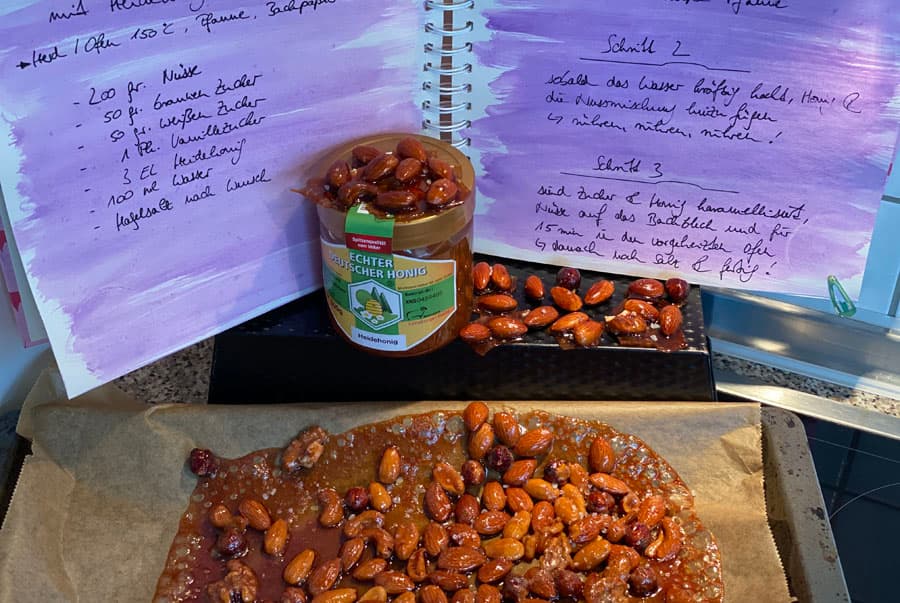 - Schritt: Nussmischung und Honig dazu, kräftig rühren, bis die Nüsse langsam karamellisieren