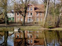 Vor dem Mühlengebäude leitet Sie die Wegmarkierung nach links. Hinter der großen Holzscheune sehen Sie den Beginn der Telegrafenmasten und einen aufgestellten Findling mit Wandermarkierungen. Dort biegen Sie nach rechts in einen Feldweg ein. Wenden Sie sich nach rechts und überqueren Sie auf der „Kühbrücke“ den Seppenser Mühlenbach. In Kürze erreichen Sie die ersten Häuser des Dorfes Holm-Seppensen.