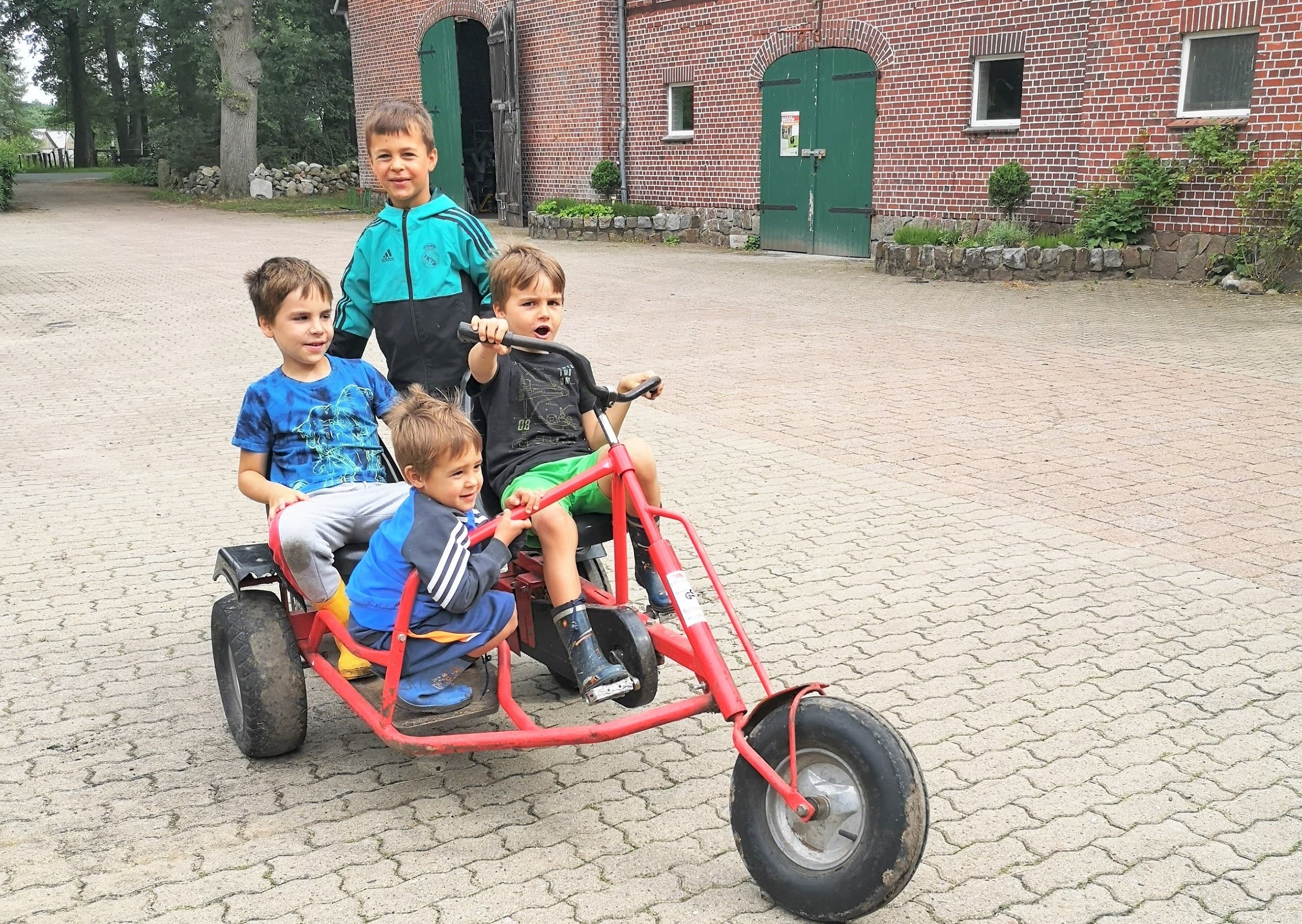 Die Kids dürfen mit dem Bauern auf dem Traktor mitfahren, im Stroh spielen, beim Füttern mithelfen, Tiere streicheln, Gokart und Trike fahren, Trampolin springen. Tarzanschaukel, Rutsche, Baumhaus, Sandplatz gehören zum Spielplatz dazu.