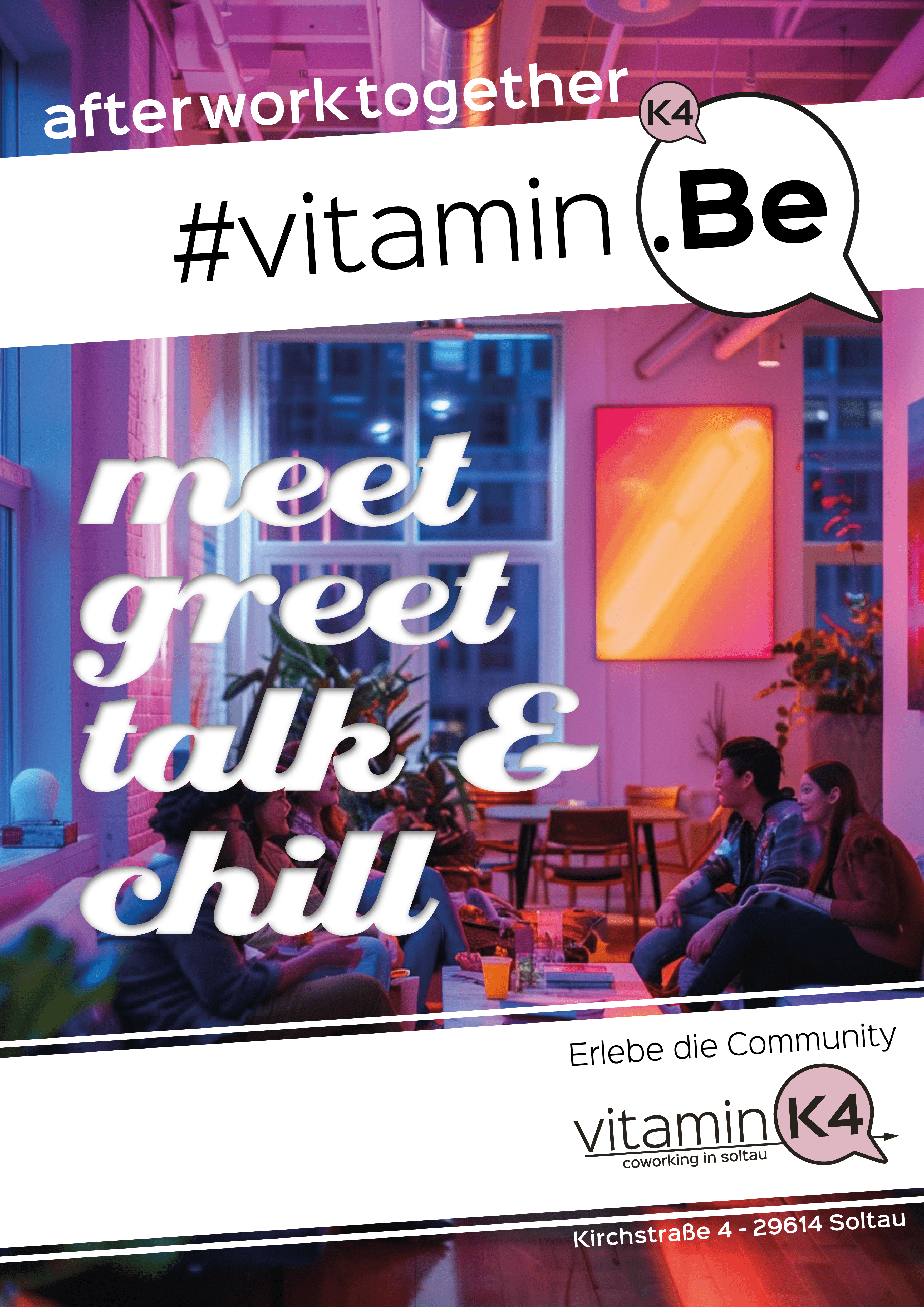 SoltauNach deiner Arbeit direkt auf einen Abstecher ins vitamin K4 – falls du nicht eh schon dort bist. Wir freuen uns auf interessante Gespräche, nette Atmosphäre und authentische Menschen rund um den Kontext des Neuen Arbeitens - meet, greet, talk & chill bei unserem #vitamin.Be - after work together.