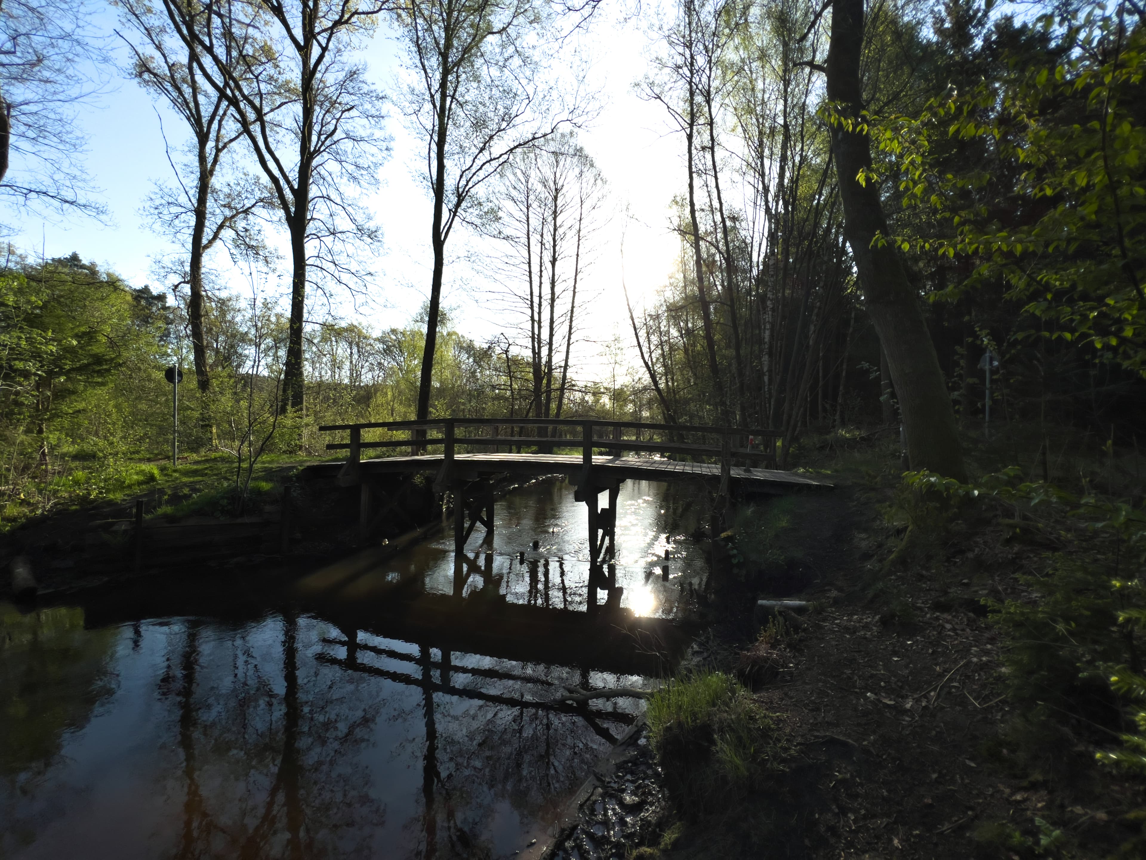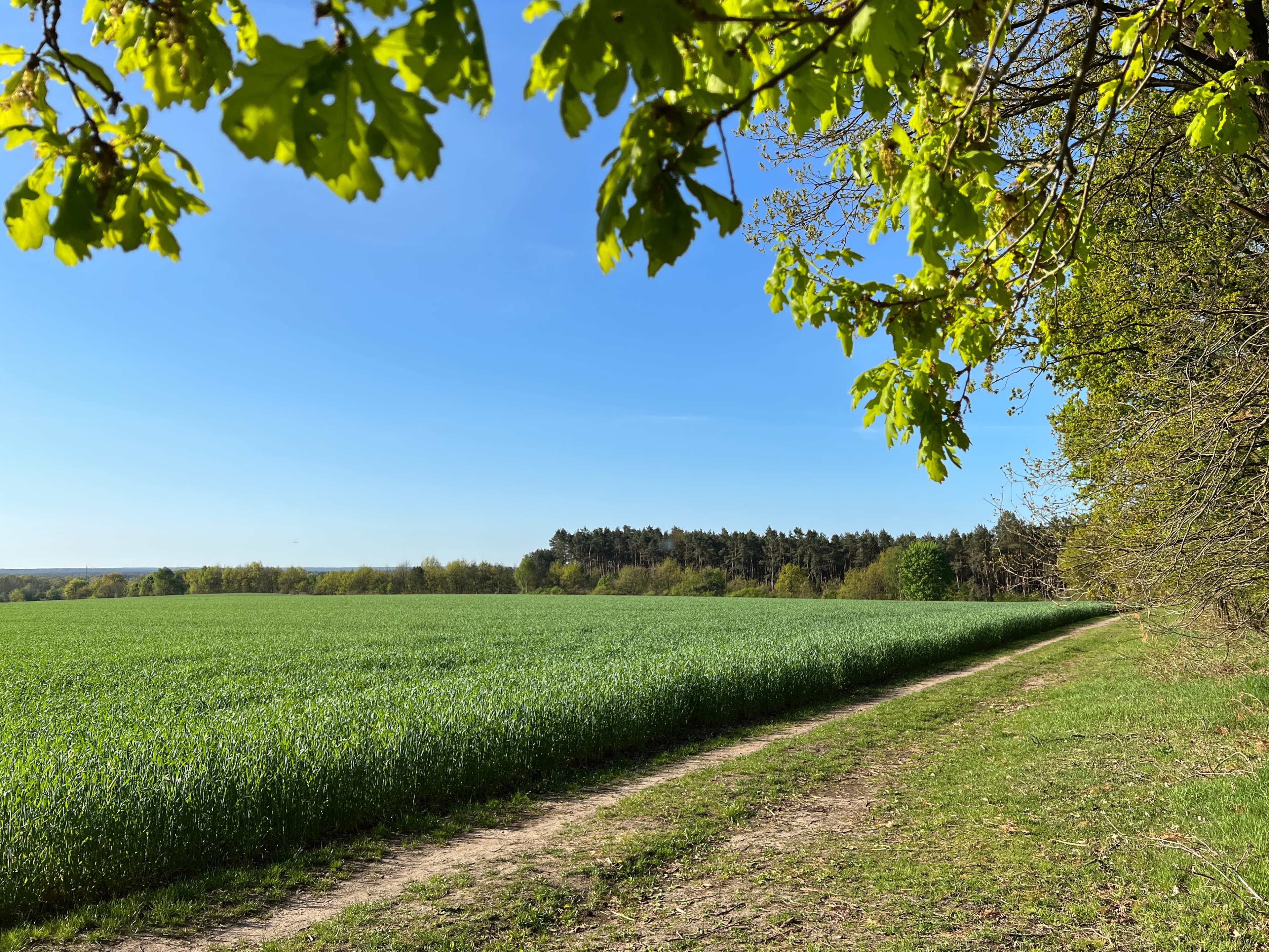 Eine kleine Holzbrücke führt über die Wietze. Ein plätschernder Bach ist das nicht, aber ein schöner, kleiner Wasserlauf allemal. Von der Brücke hat man sehr schöne Einblicke in die Natur und das Leben am Wasser. Ein guter Platz für eine kurze Rast. Der folgende Wegabschnitt führt dann durch Ackerflächen, auf denen die Saat aufgegangen ist und ich habe einen schönen Blick in die weite Landschaft.