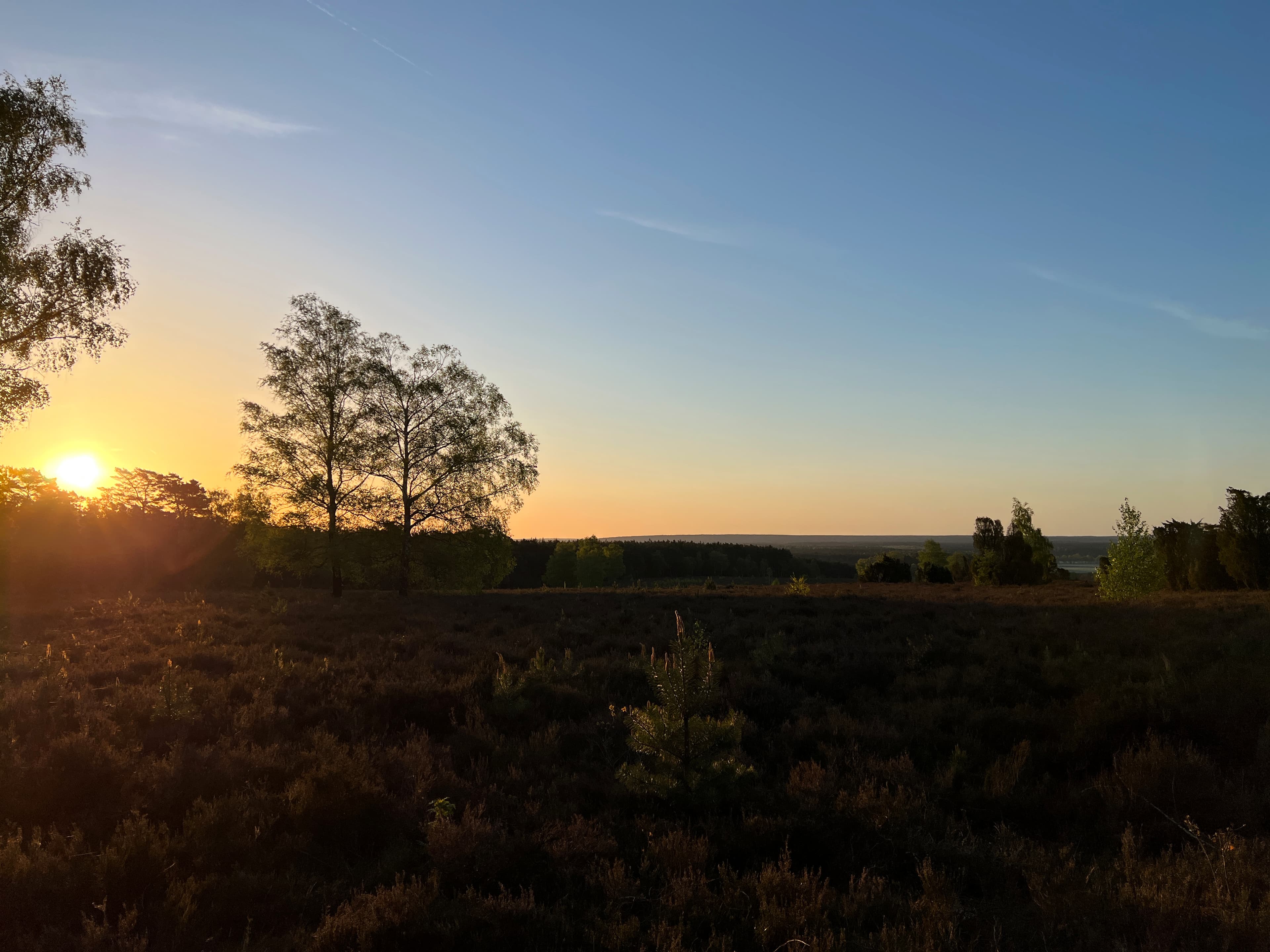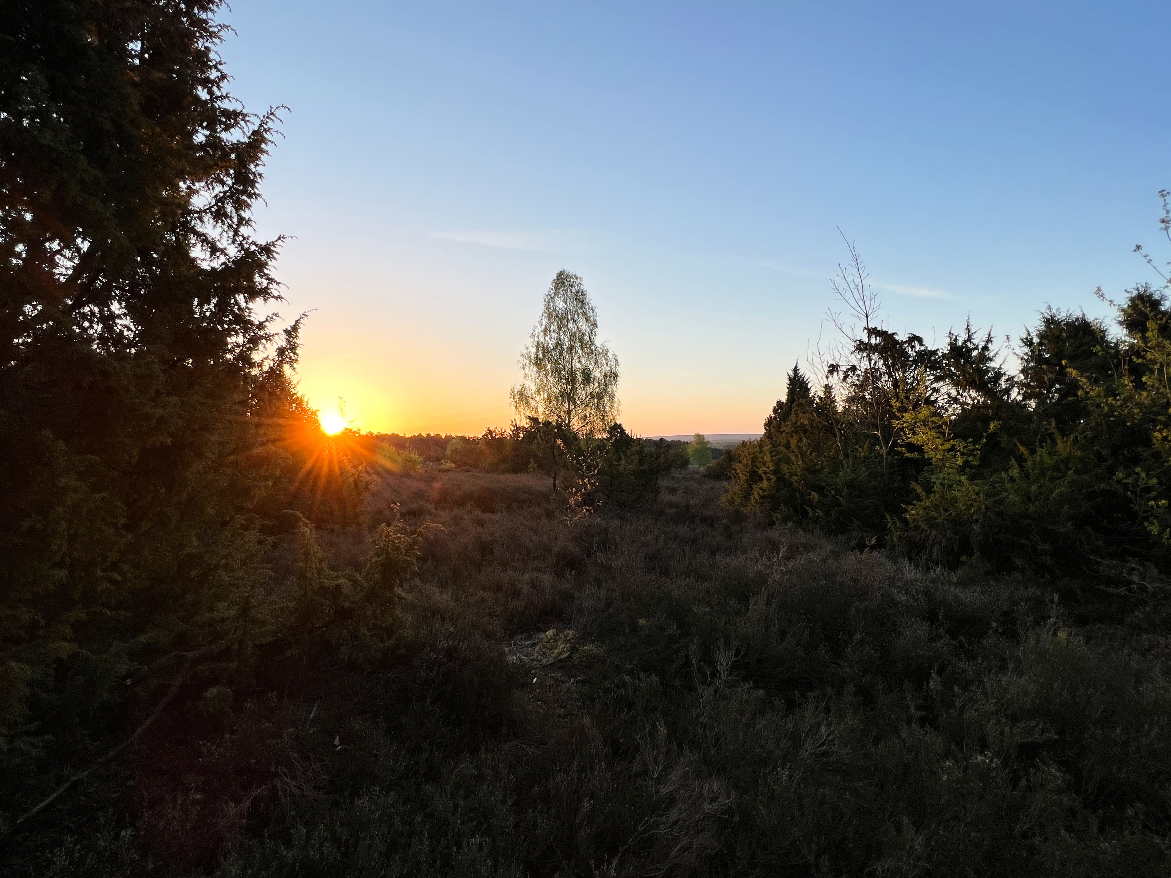 Das Wetter spielt mit: Sonne satt, Temperaturen um 20 Grad. Das bringt mich auf eine Idee. Man kann diese Heideschleife an zwei Punkten beginnen und mich reizt ein schöner Sonnenaufgang am Wietzer Berg. Natürlich ist der Parkplatz um 5:30 Uhr leer und nach einem kurzen Ausrüstungs-Check laufe ich den leicht ansteigenden Weg hinauf zum Hermann-Löns-Stein. Von hier aus habe ich einen herrlichen Blick auf das Örtze-Tal im Morgenlicht. Dieser Moment gehört mir und ich genieße die besondere Stimmung am frühen Morgen.