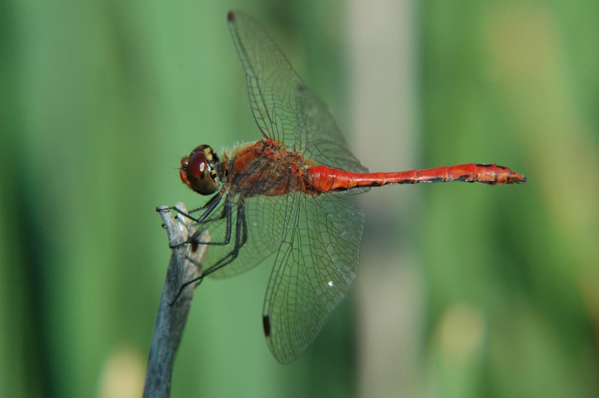 Im Vergleich zu anderen Libellen ist die Heidelibelle mit ihren 4 cm eher klein. Doch aufgrund ihrer rotschillernden Farbe ist sie in der Natur für das menschliche Auge hervorragend zu erkennen.