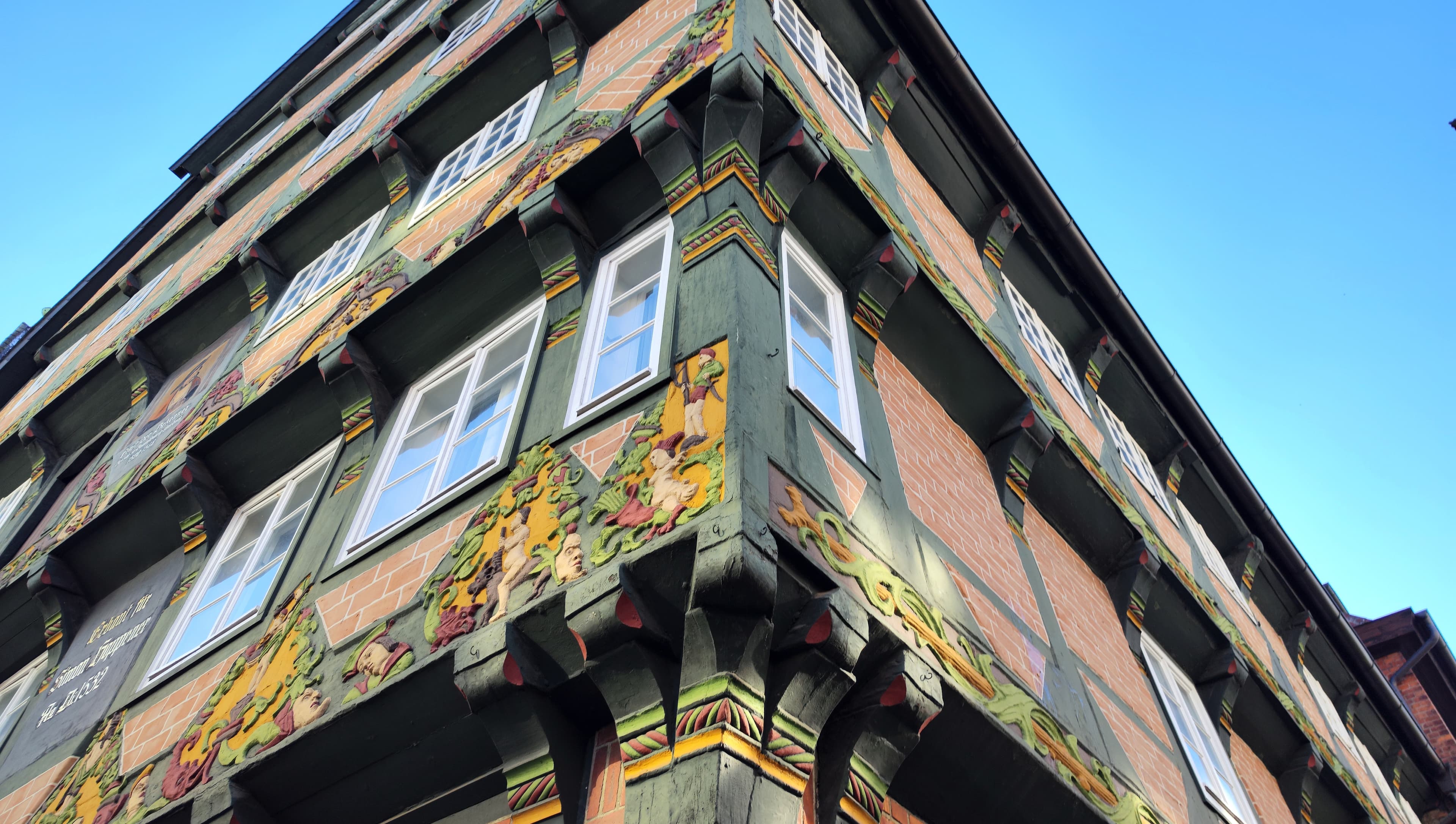 närrischen Gestalten und reichen Schnitzereien machen dieses Fachwerkhaus