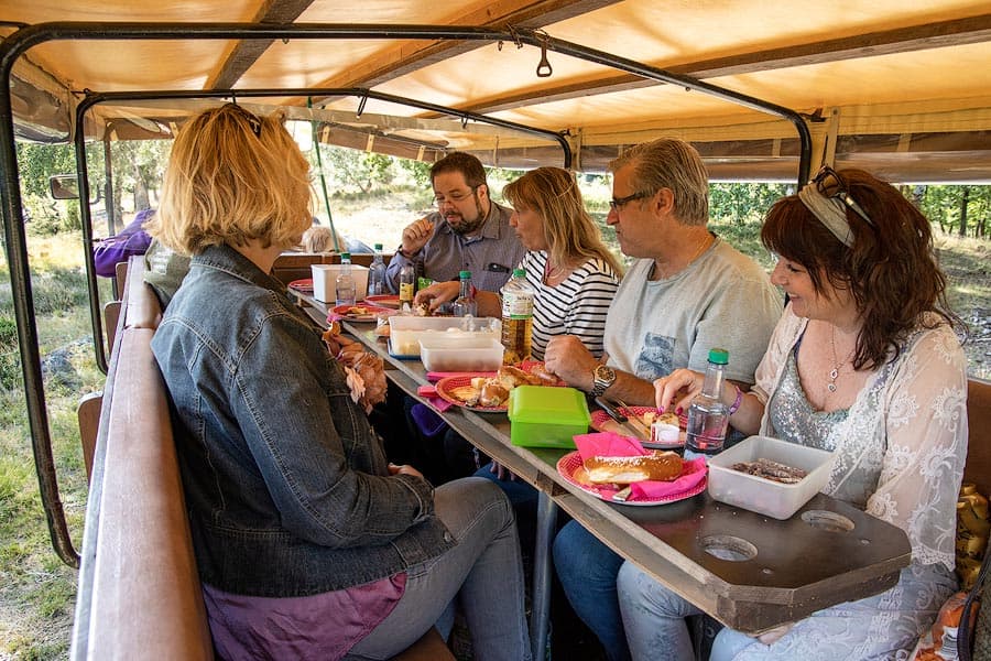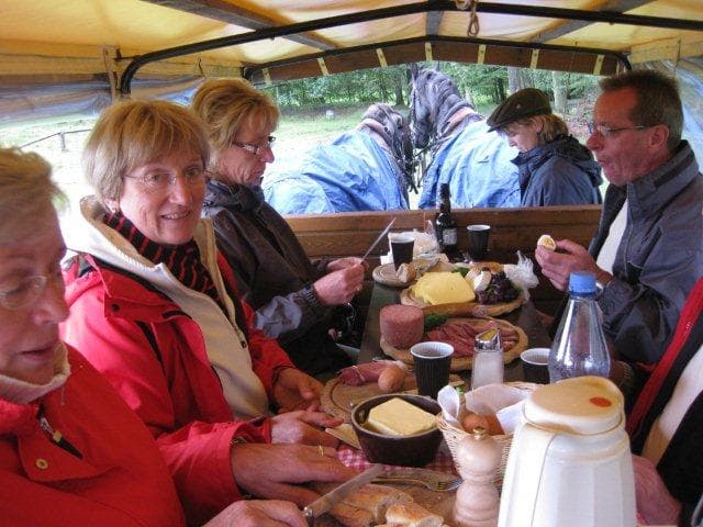 Geeignet für alle Gruppenfahrten wie z.B. Kegelclubs, Junggesellenabschiede oder Familienausflüge. Unsere Planwagen sind sehr gesellig und vor allem wetterunabhängig. Transparente Seitenplanen lassen sich, bei wechselhaften Wetter, mit wenigen Handgriffen herunter. Ein Tisch in der Mitte, lädt zu einem gemütlichen Picknick im Grünen ein.