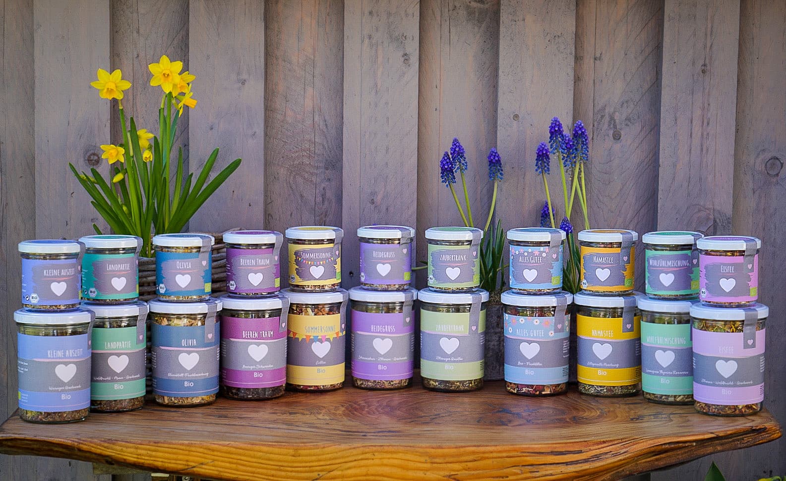 Begonnen haben wir 2019 mit 7 verschiedenen Teemischungen, heute sind es bereits 18 Sorten. Dazu gehört der "Heidegruss".