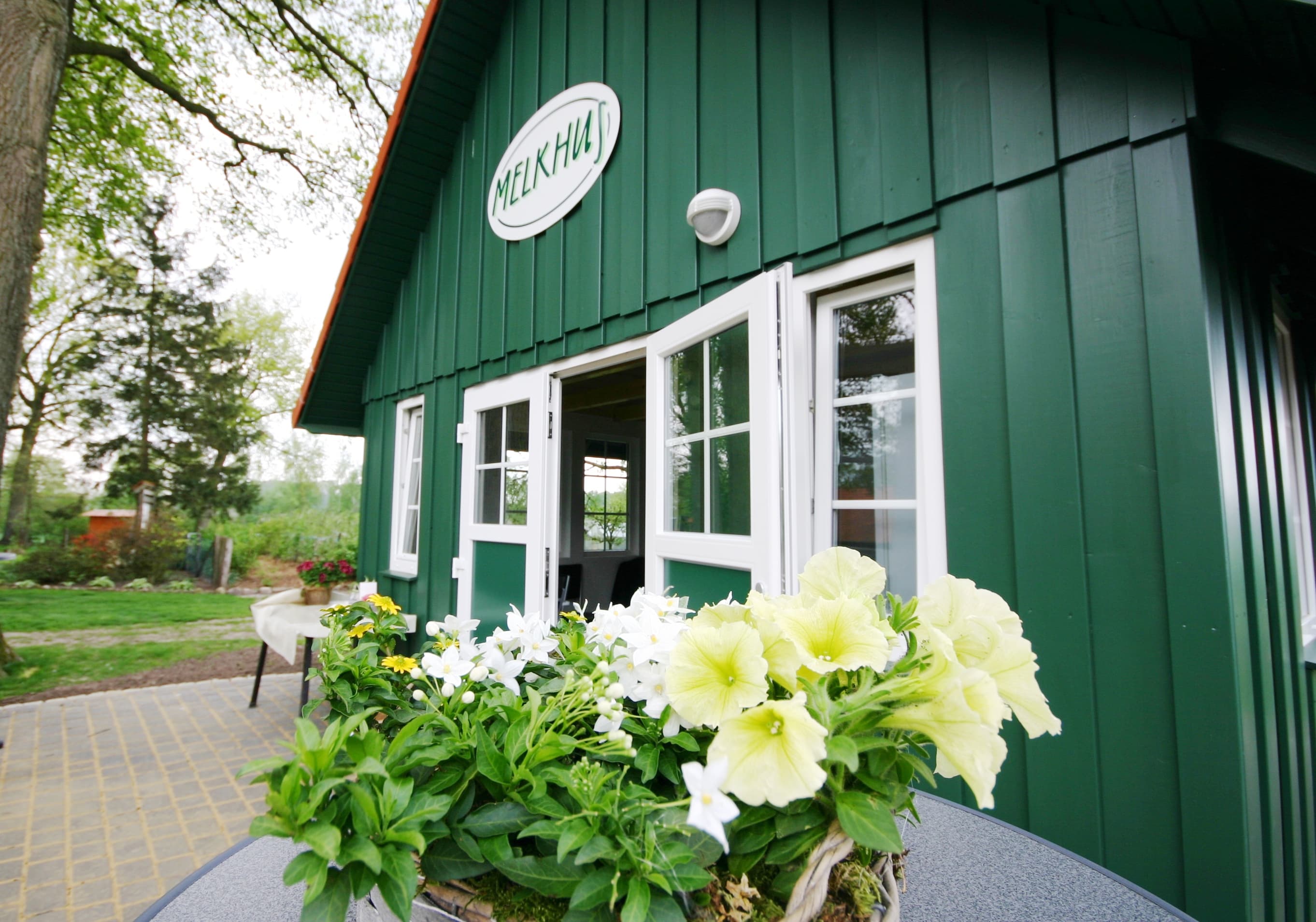 Ein Melkhus ist ein grünes Holzhaus direkt am Bauernhof gelegen in unmittelbarer Nähe eines Radweges. Die Landfrauen bieten Ihnen dort Milchspezialitäten und Produkte aus der Region an.
