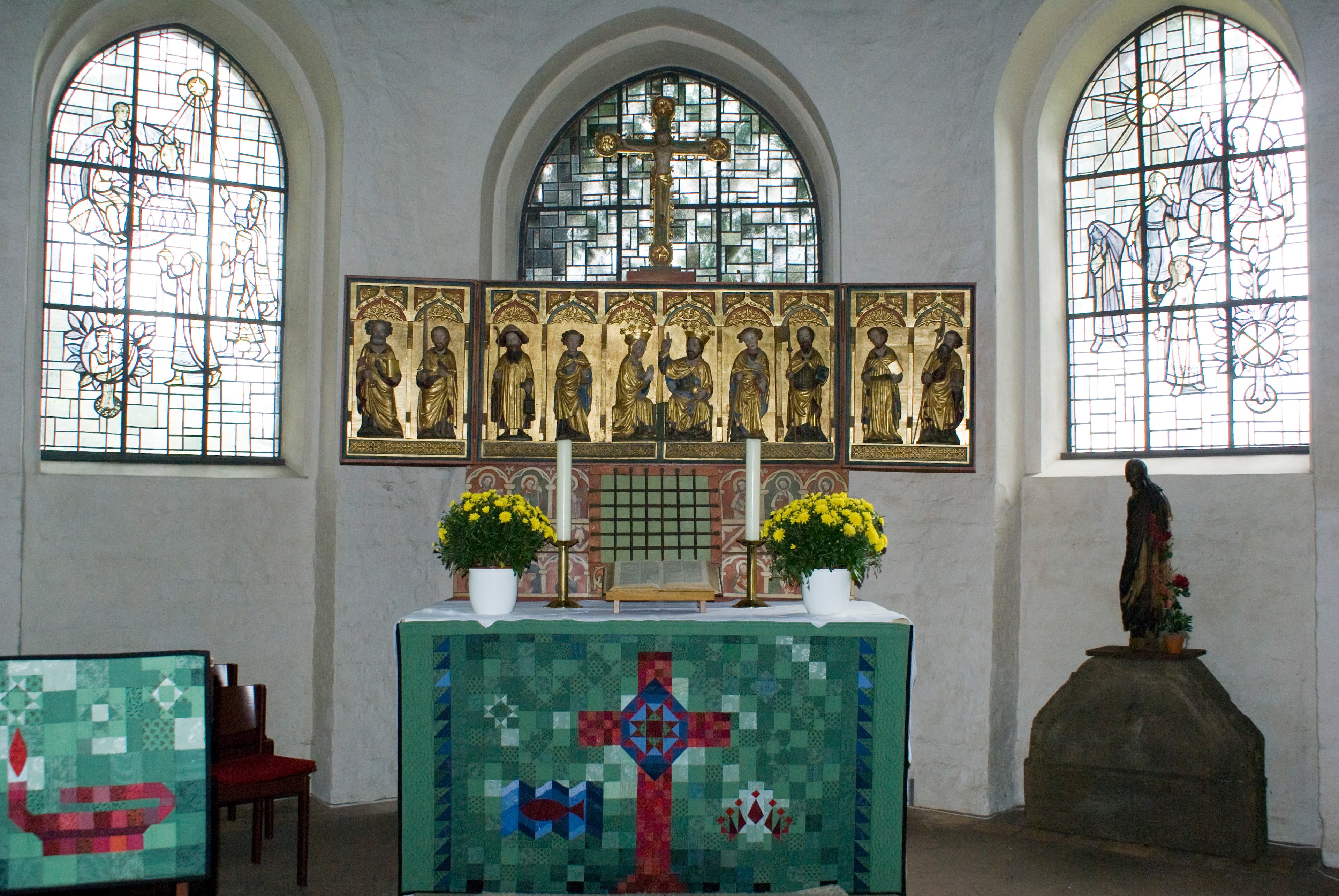Sehr wertvoller Altaraufsatz: Über dem Altartisch ein ehemaliger Reliquienschrein des 14. Jahrhunderts, in dessen Mitte die Reliquienkammer, daneben gemalte Halbfiguren in Bogenfeldern (jetzt Kopien, bruchstückhafte Originale darunter). Darüber ein dreiflügeliger Schnitzaltar (Lüneburger Arbeit von ca. 1430, neu zusammengesetzt 1936) mit Christus, Maria und je vier Aposteln. Sehr schöne Pietà (um 1430). Schöne Patronatsprieche mit Gitterwerk und Schnitzereien (1677). Kanzel von 1615, eine Stiftung der Familie von Weyhe. Taufstein aus dem Fuß einer alten Steinkanzel (17. Jh.). Bildfenster im Chorraum von Renate Strasser: Weihnachts- und Osterfenster.