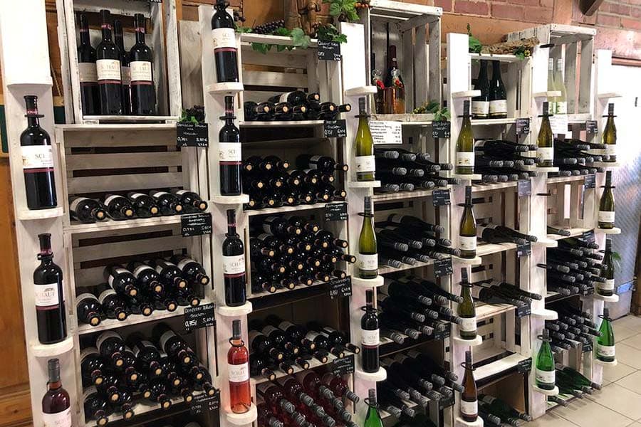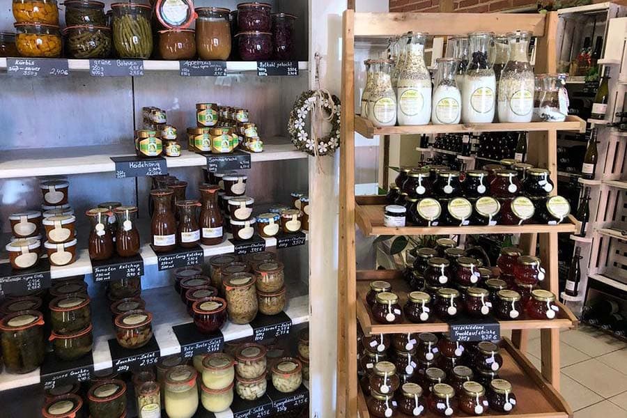 Auch weiter verarbeitete Produkte wie herzhafte Darmwurst und Wurstkonserven, Fruchtaufstriche, Frucht- und Gemüsesäfte und ausgesuchte Weine vom Weingut Schauf vervollständigen das Sortiment.