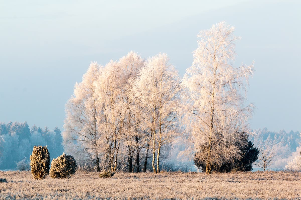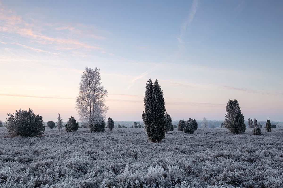 Die dunkelgrünen Wacholder stehen besonders während der Heideblüte im August und September in einem fantastischen Kontrast zum Lila der Heide. Auf dieser Fläche sind die Wacholder baumartig gewachsen, was selten ist.
