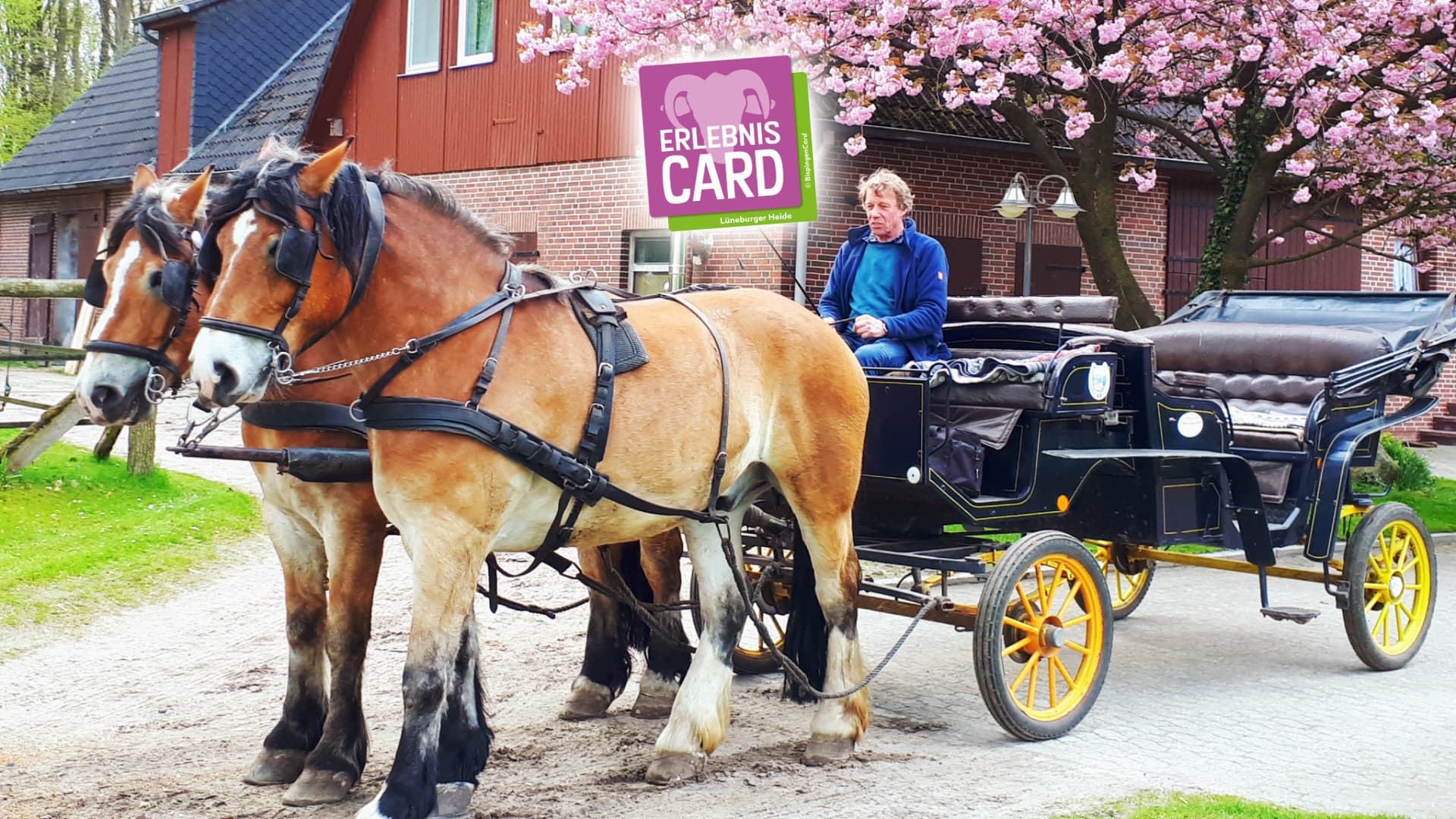 Lassen Sie sich vom Kutscher und seinen zwei starken Pferden die schönsten Plätze der Lüneburger Heide zeigen. In Decken warm verpackt und durch ein Faltdach mit durchsichtigen Seitenteilen geschützt, können Sie Ihre Kutschfahrt auch bei Wind und Regenwetter genießen.