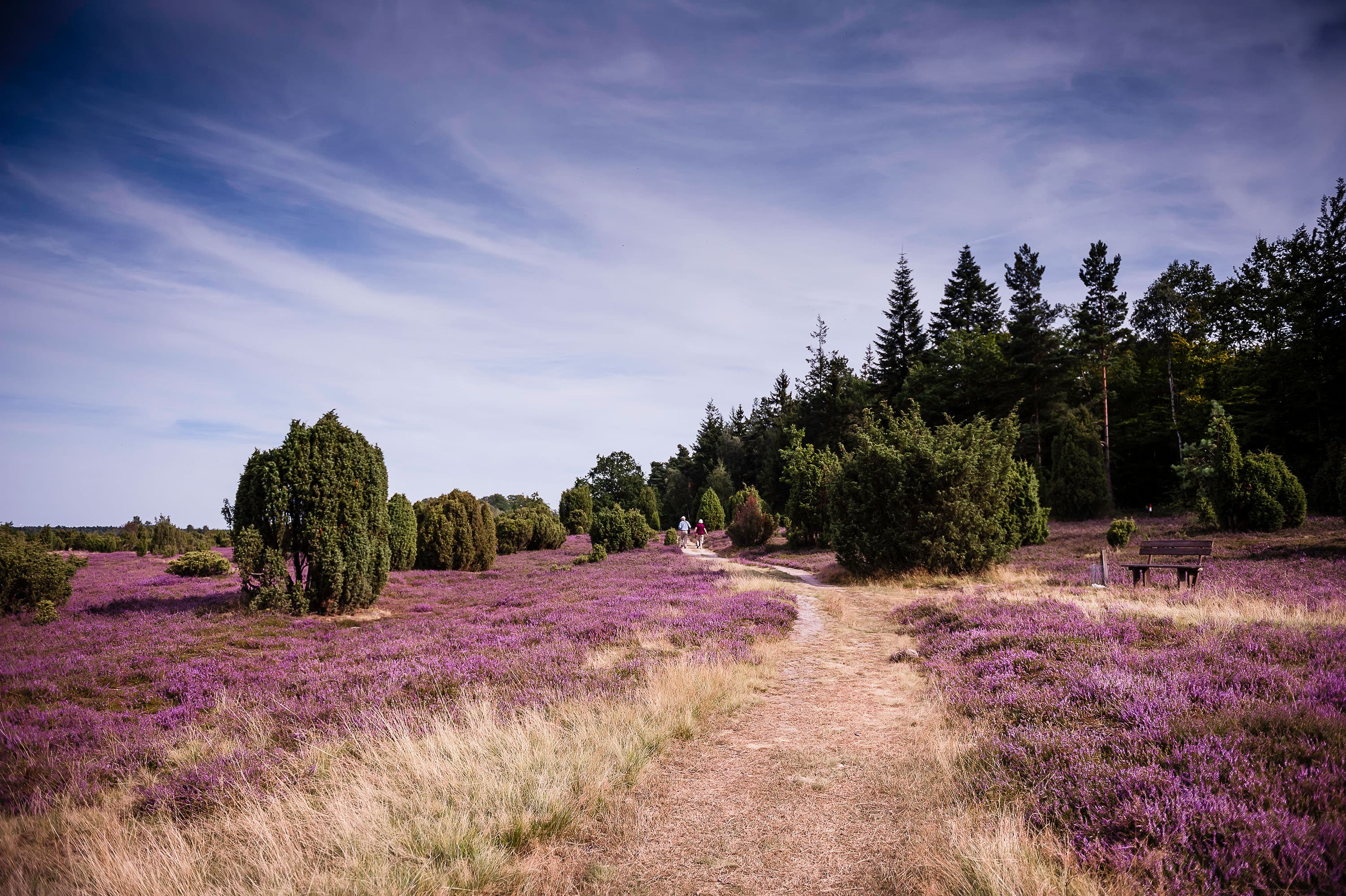 Wie zufällig hingestreute sattgrüne Wacholdersträucher durchbrechen die Heideflächen, welche zur Blütezeit im Spätsommer durch ihre Lilatöne wie eine leuchtende Patchworkdecke auf dem Areal liegen.