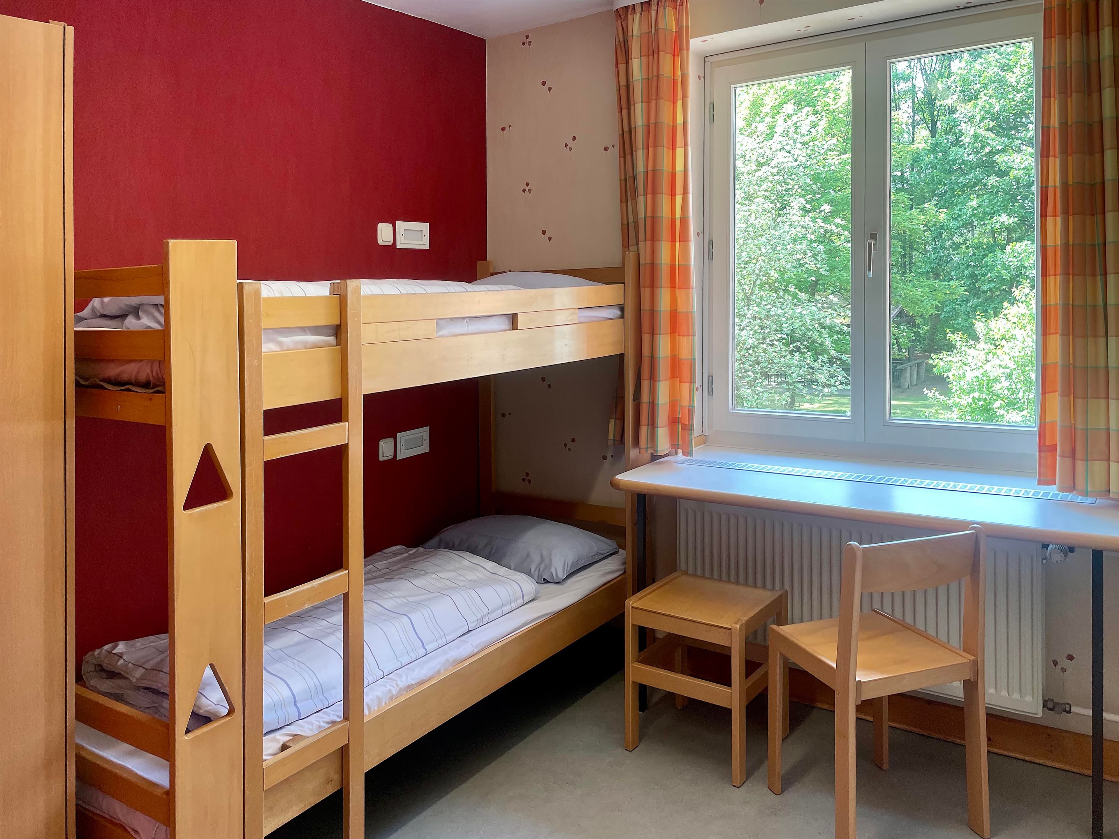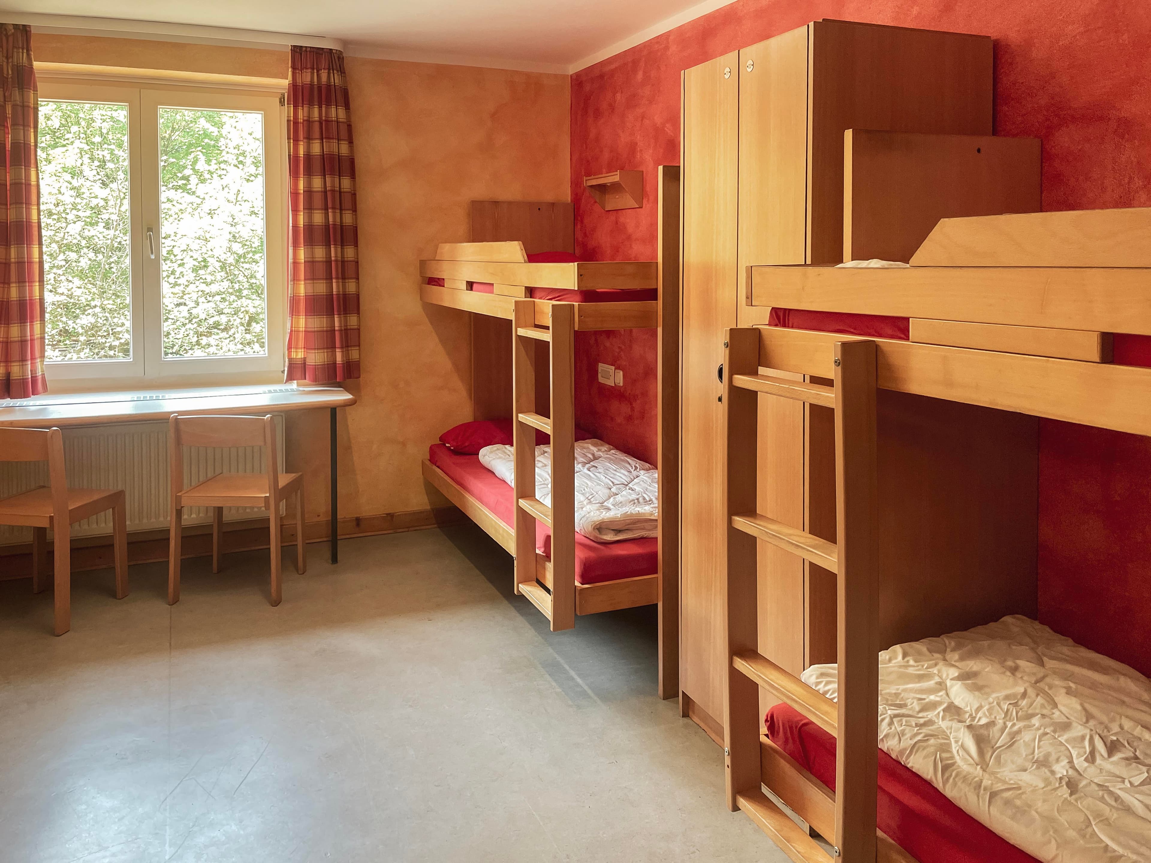 Bis zu 164 Gäste fühlen sich in den mit Waschgelegenheit und/oder Dusche und WC ausgestatteten Ein- bis Sechsbettzimmern bestens aufgehoben. Das barrierefreie Erdgeschoss eignet sich vorzüglich für Rollstuhlfahrer*innen. Etwas abseits liegt das Familienappartement, das mit vier Zimmern, zwei Bädern und Teeküche viel Platz bietet. Familienfreundliche Zimmer stehen euch ebenso zur Verfügung wie unseren kleinsten Gästen Hochstühle, Kinderbetten, Fläschchenwärmer und Kinderhocker. Spiel-, Wickel- und Fernsehzimmer, eine kleine Teeküche sowie unser Bollerwagen tragen zum gelungenen Familienaufenthalt bei.