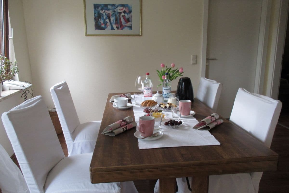 Unsere Wohnung liegt im Obergeschoss der Restaurant- und Hotelanlage „Ferien auf der Heid“ und ist der Waldseite zugewandt. Der Eingangsbereich ist zugleich Diele und Essbereich. Der helle Essbereich ist mit einem Tisch und 4 Stühlen geschmackvoll gestaltet. Von hier aus gelangen Sie auch in alle anderen Räumlichkeiten.