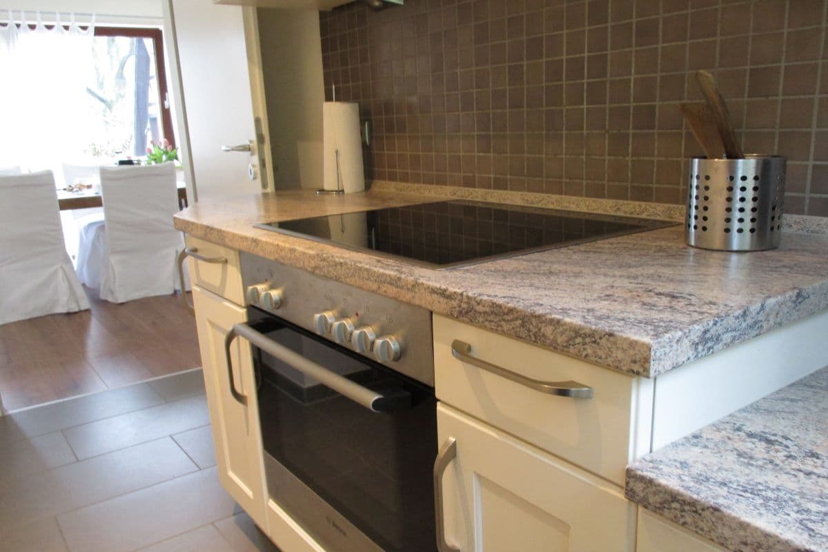 Die Küche haben wir für Sie komplett und zweckmäßig eingerichtet. So gehören zum Inventar neben einem Herd mit Backofen, Wasserkocher, Toaster, Kaffeemaschine, Kühlschrank mit TK Fach, Spüle auch eine Waschmaschine. So steht einer längeren Aus-Urlaubs-oder Mietzeit auch nichts im Wege. Verpflegung
