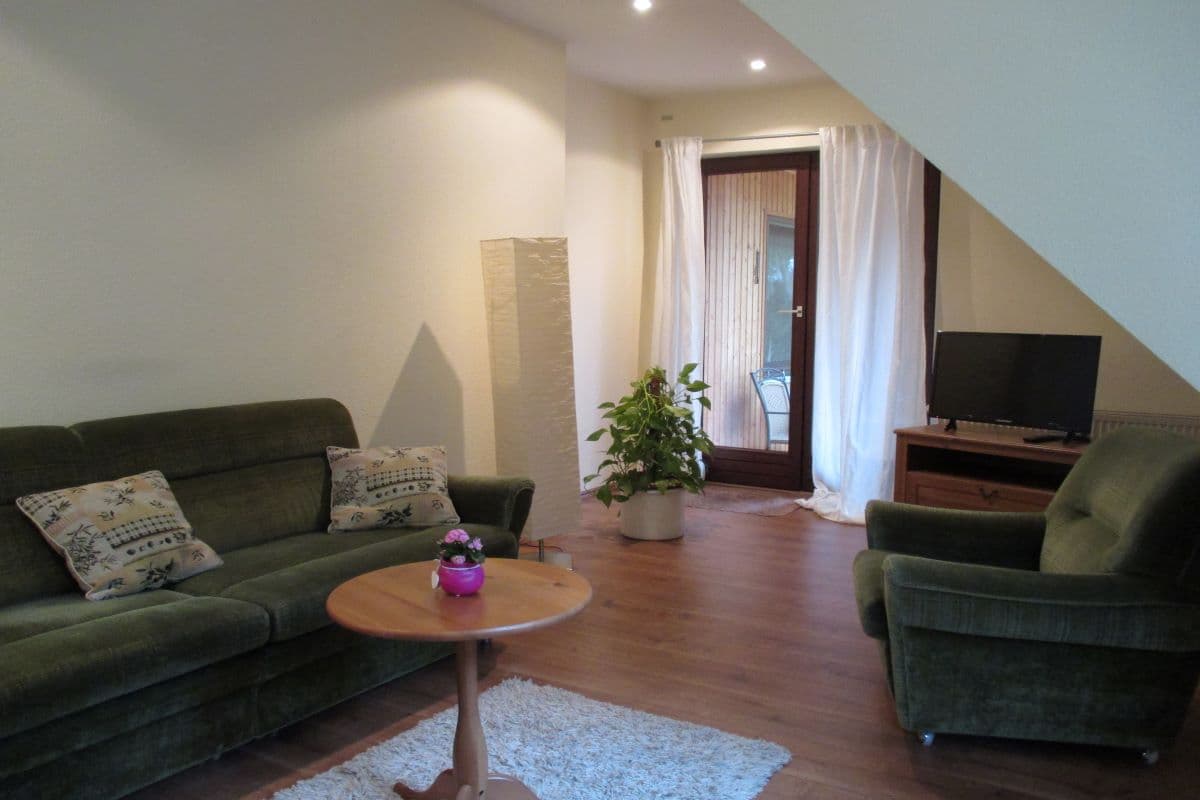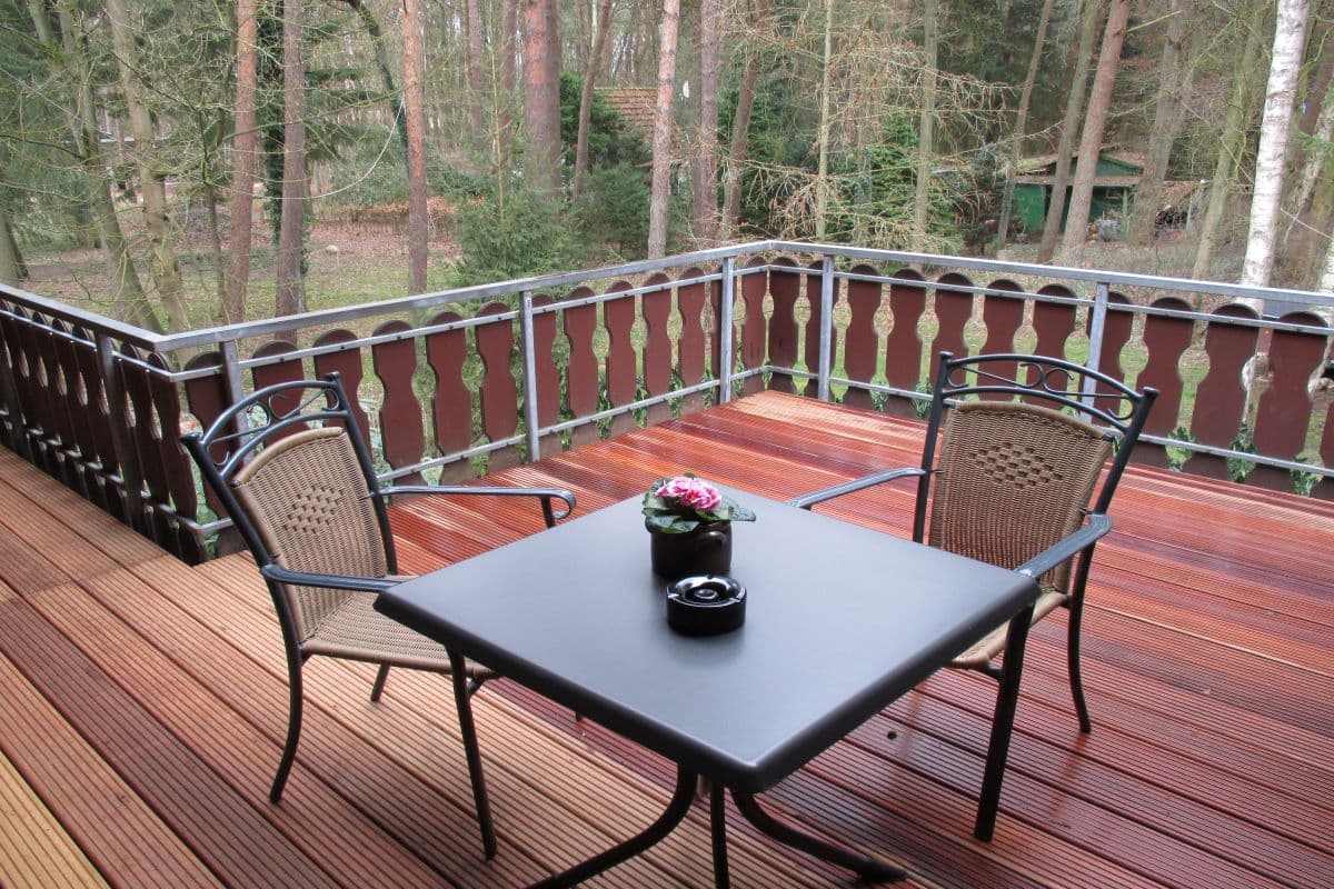 Das angrenzende Schlafzimmer, in weiss gehalten, verfügt über ein französisches Bett (140x200 cm) einen Einbauschrank sowie Kommode. Im Wohnzimmer, mit Blick ins Grüne, können Sie gemütliche Stunden verleben. Dafür sorgen eine große Couch (Schlafcouch), 2 Sessel + Couchtisch sowie ein Fernseher. Über die Stirnseite des Wohnzimmers gelangen Sie auf unsere große Holzterrasse. Zur Möblierung dieser gehören ein Tisch und Stühle sowie 2 Liegen. Das danebenliegende kleine Badezimmer verfügt über eine Dusche, WC, Waschtisch und einen Föhn.