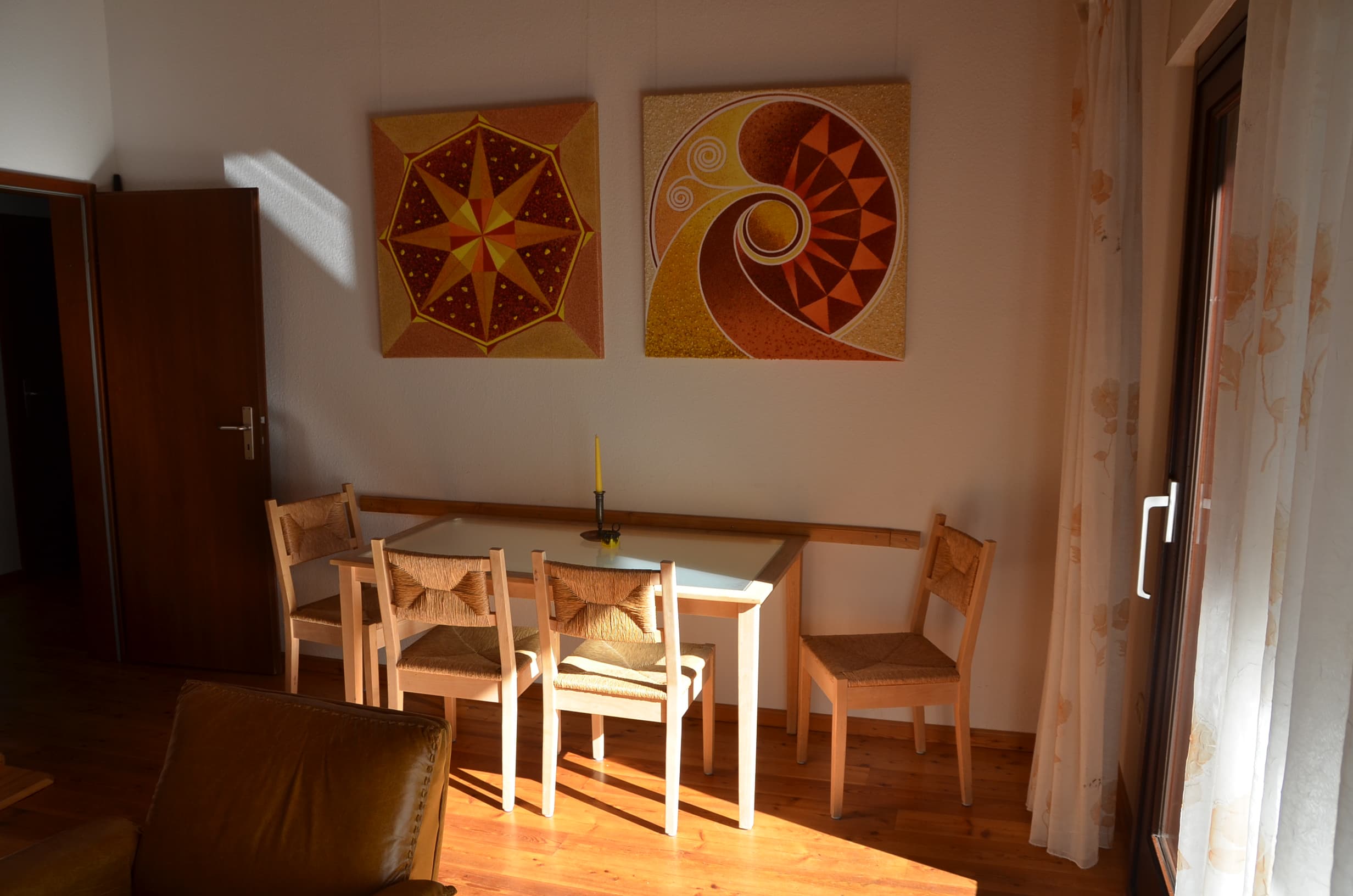 Im Flur, von dem alle Zimmer abgehen, ist der Eingangsbereich. Hier ist Platz für ihre Garderobe und Schuhe. An einem Sitzplatz am Fenster, können sie die Vögel am Futterhaus und die Eichhörnchen beim Klettern beobachten.