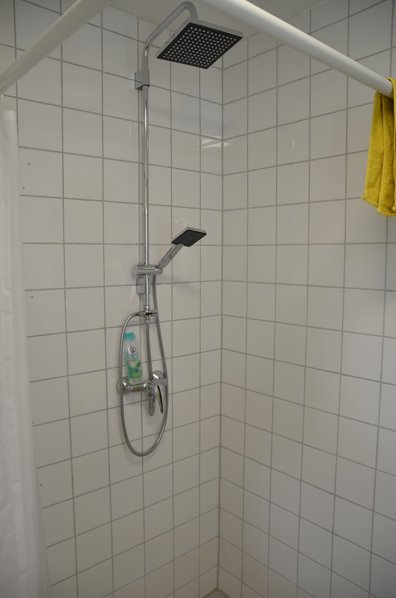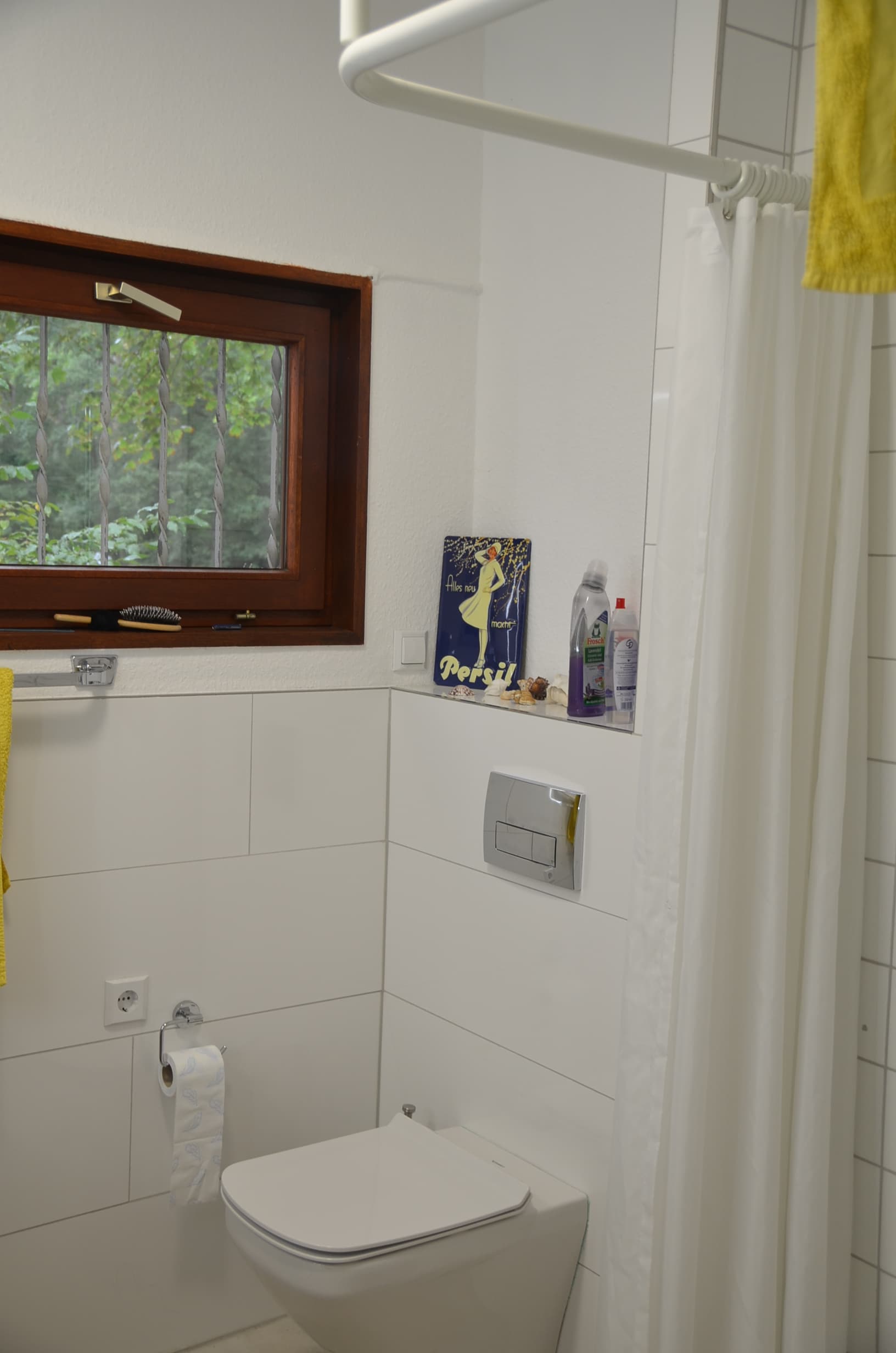 Das Badezimmer (4qm) hat eine ebenerdige Dusche, Waschbecken mit Spiegel, WC, Lüfter, Hocker, Fön und eine elektrische Fußbodenerwärmung.
