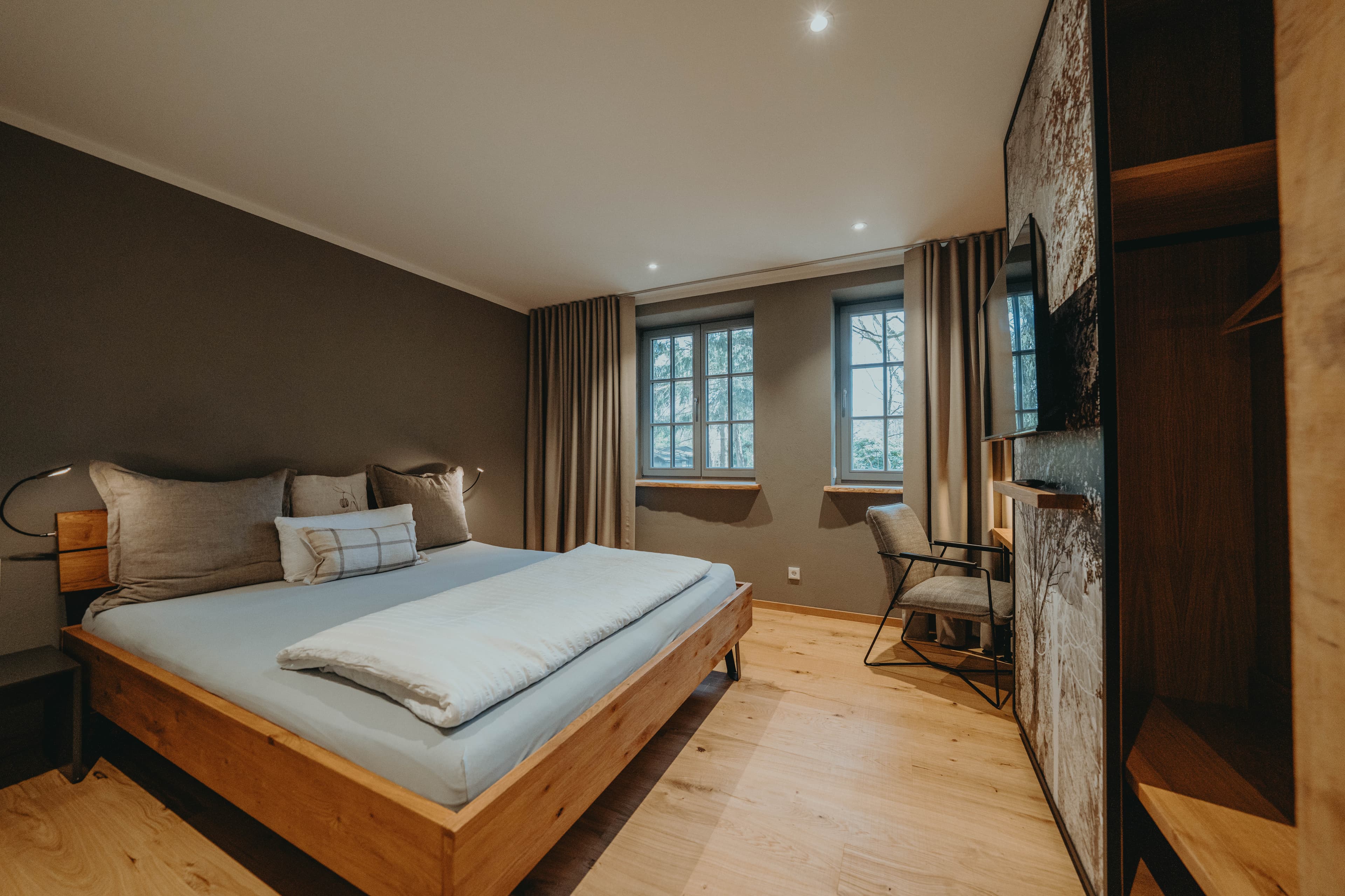 Auf einem großen blühenden Naturgrundstück stehen acht Fachwerkhäuser unter hohen Eichen und begrüßen Gäste in komfortablen Zimmern unterschiedlicher Kategorien. Alle Zimmer unseres Biohotels haben ein ruhiges, ausgeglichenes Raumklima und bequeme, schlaffördernde Bettsysteme. Natürliche Stoffe in warmen Farben und Einrichtungsgegenstände in klarem Design. Dazu viel Licht und Luft gepaart mit weiten Ausblicken.