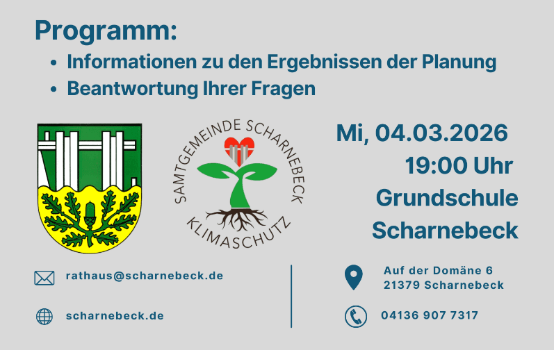 ScharnebeckDie Samtgemeinde Scharnebeck lädt alle Bürgerinnen und Bürger zur Informationsveranstaltung über die Ergebnisse der Wärmeplanung ein. Ziel der Planung ist es, die lokale Wärmeversorgung bis spätestens 2045 klimaneutral zu gestalten.