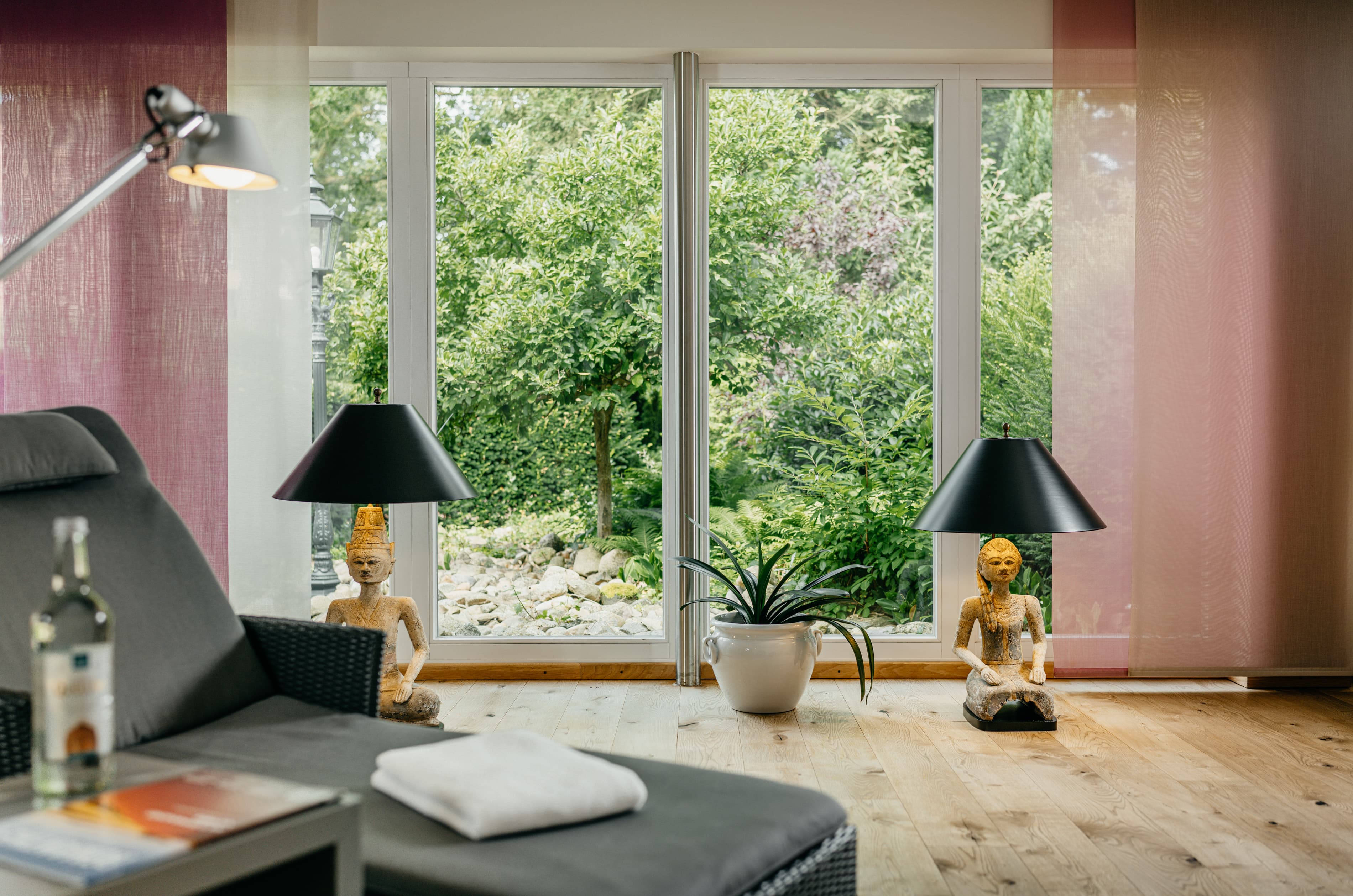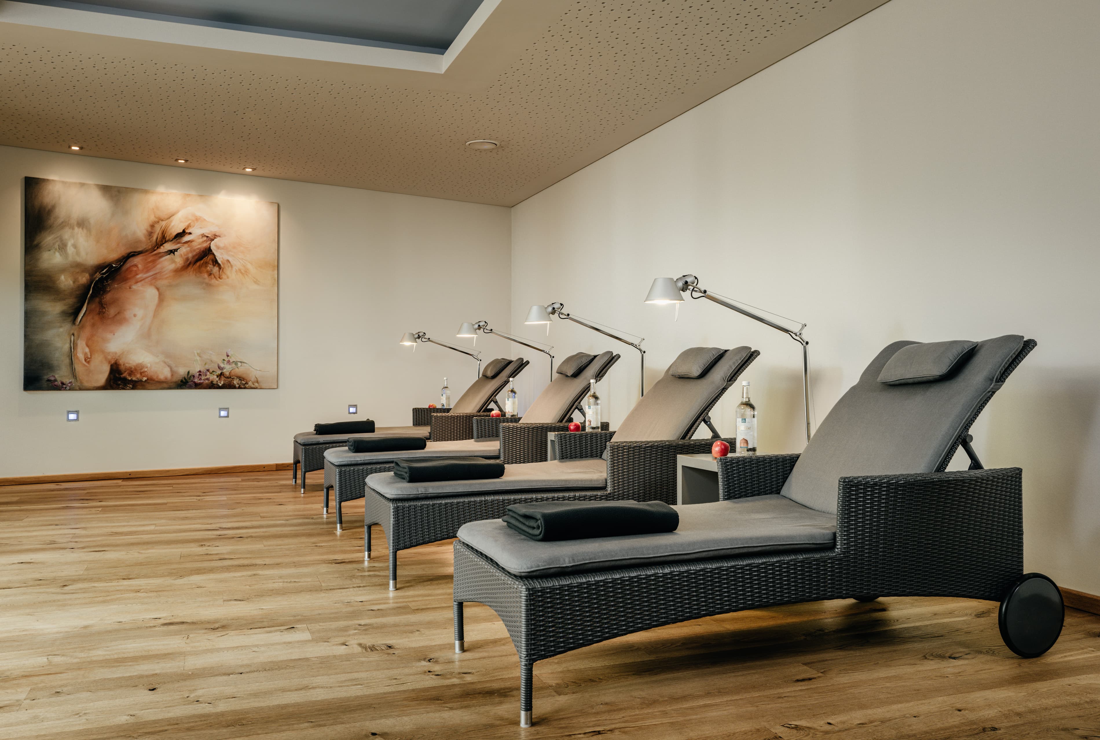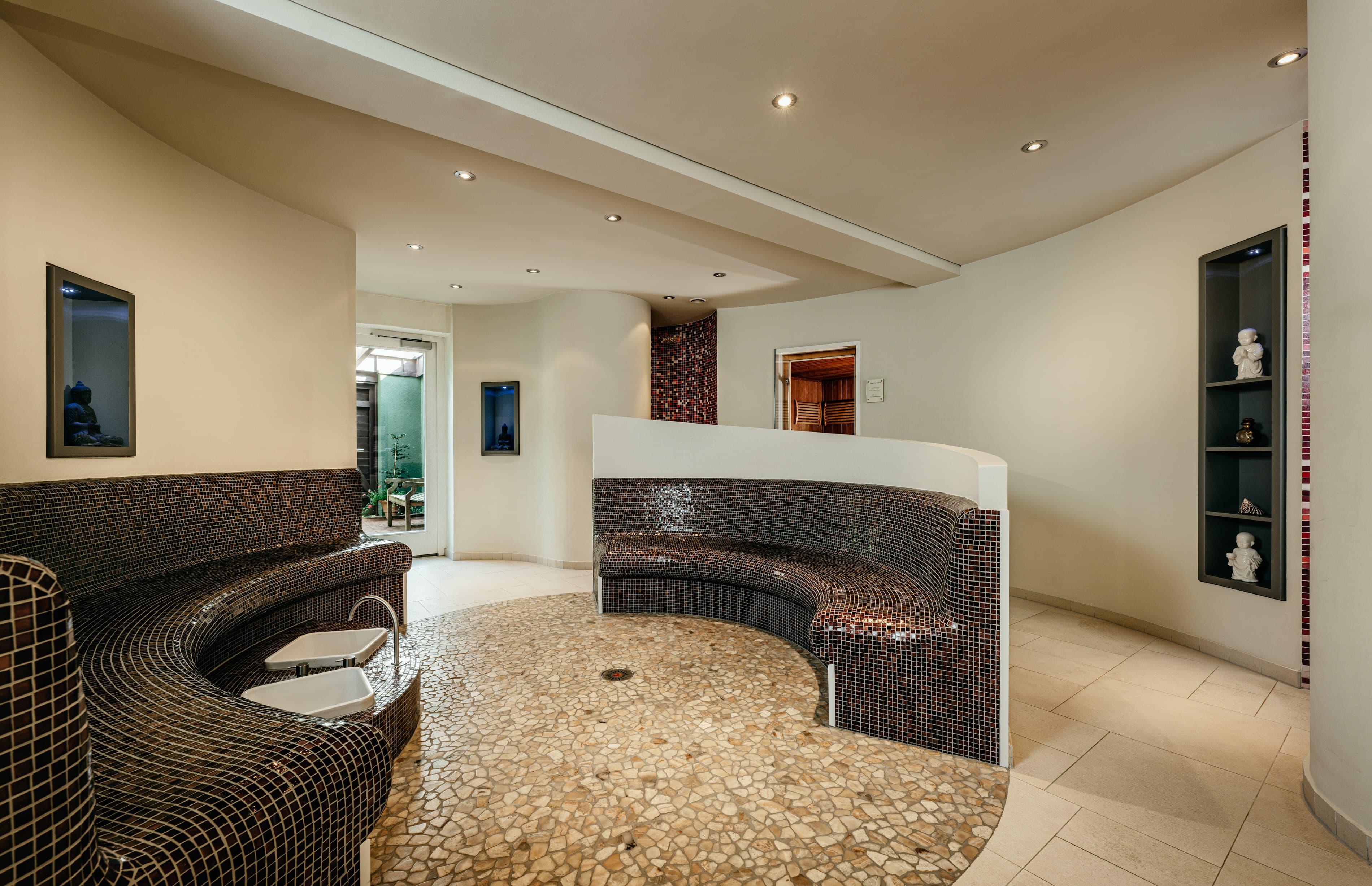 Genießen Sie die finnische Sauna, eine Bio-Sauna mit Farblichttherapie, eine Physio-Therm Infrarotkabine, Wärmebänke mit Kneipp-Fußbädern, einen kleinen Fitnessraum und einen großzügigen Ruheraum mit Blick in den Garten.