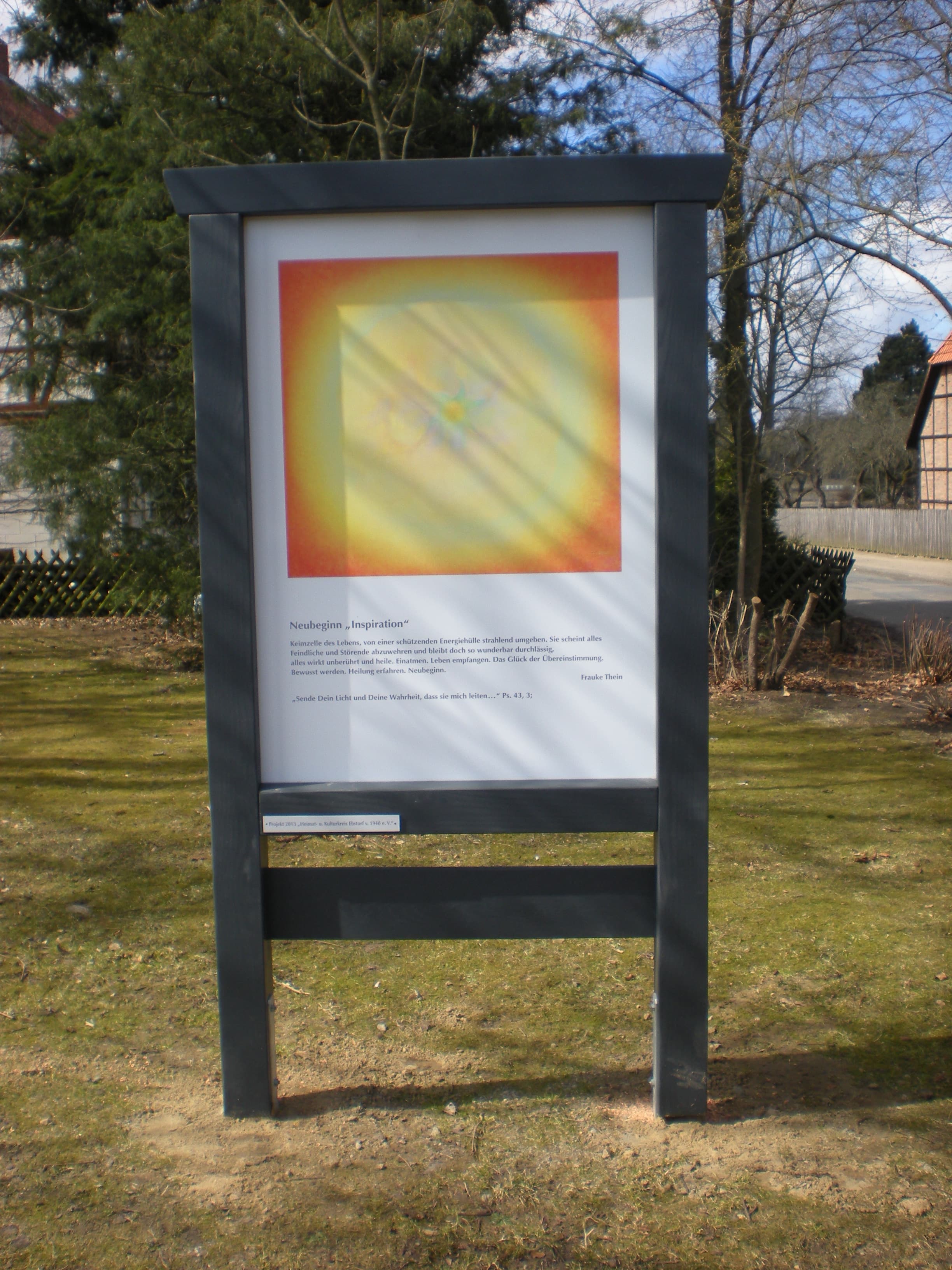 Bildern, die sie für den InspirationsWeg geschaffen hat, werden die Gefühle wie Angst, Unbeschwertheit, Zorn oder Harmonie und die emotionalen Erfahrungen des Lebens in ihrer Vielfalt und Gegensätzlichkeit sichtbar.