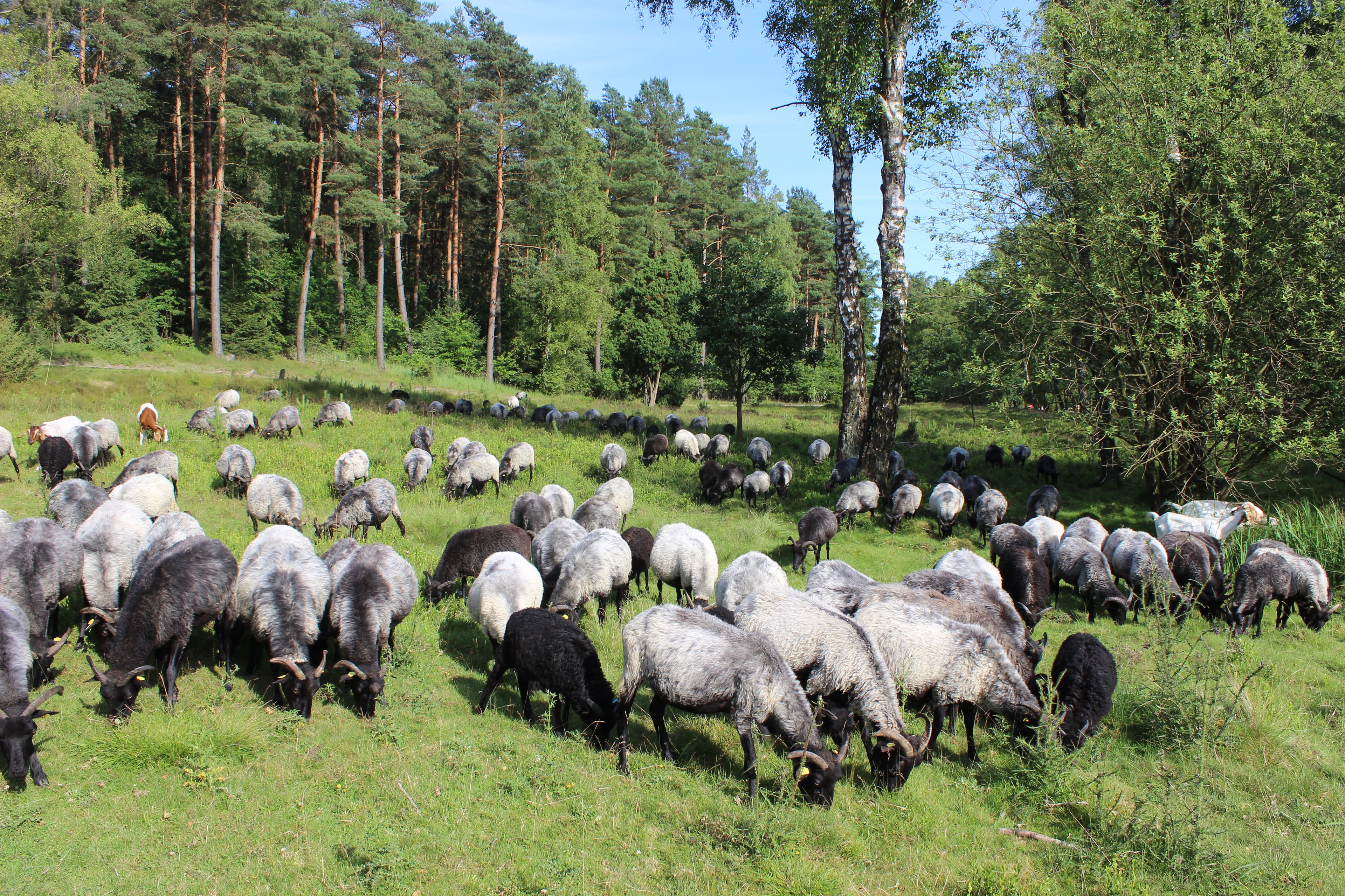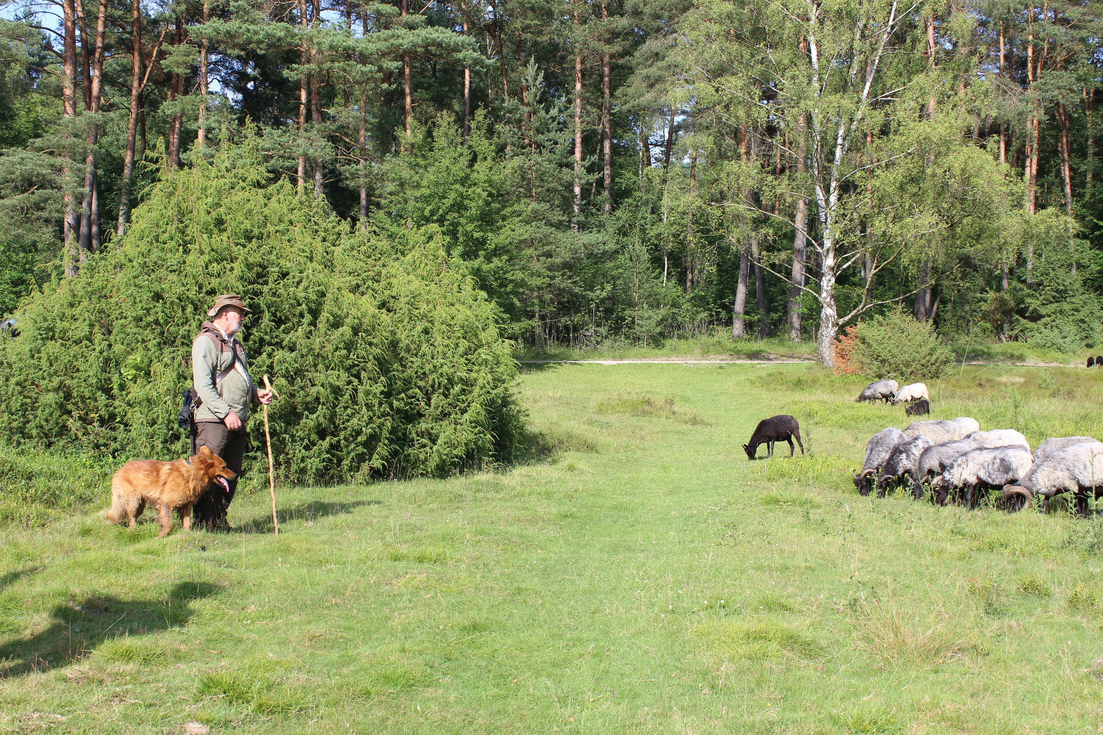 Treffpunkt war das Café im Schafstall und dann ging es mit einer kleinen Wandergruppe in das Büsenbachtal hinein. Der Schäfer kam mit seinen Showdamen - der Heidschnuckenherde.