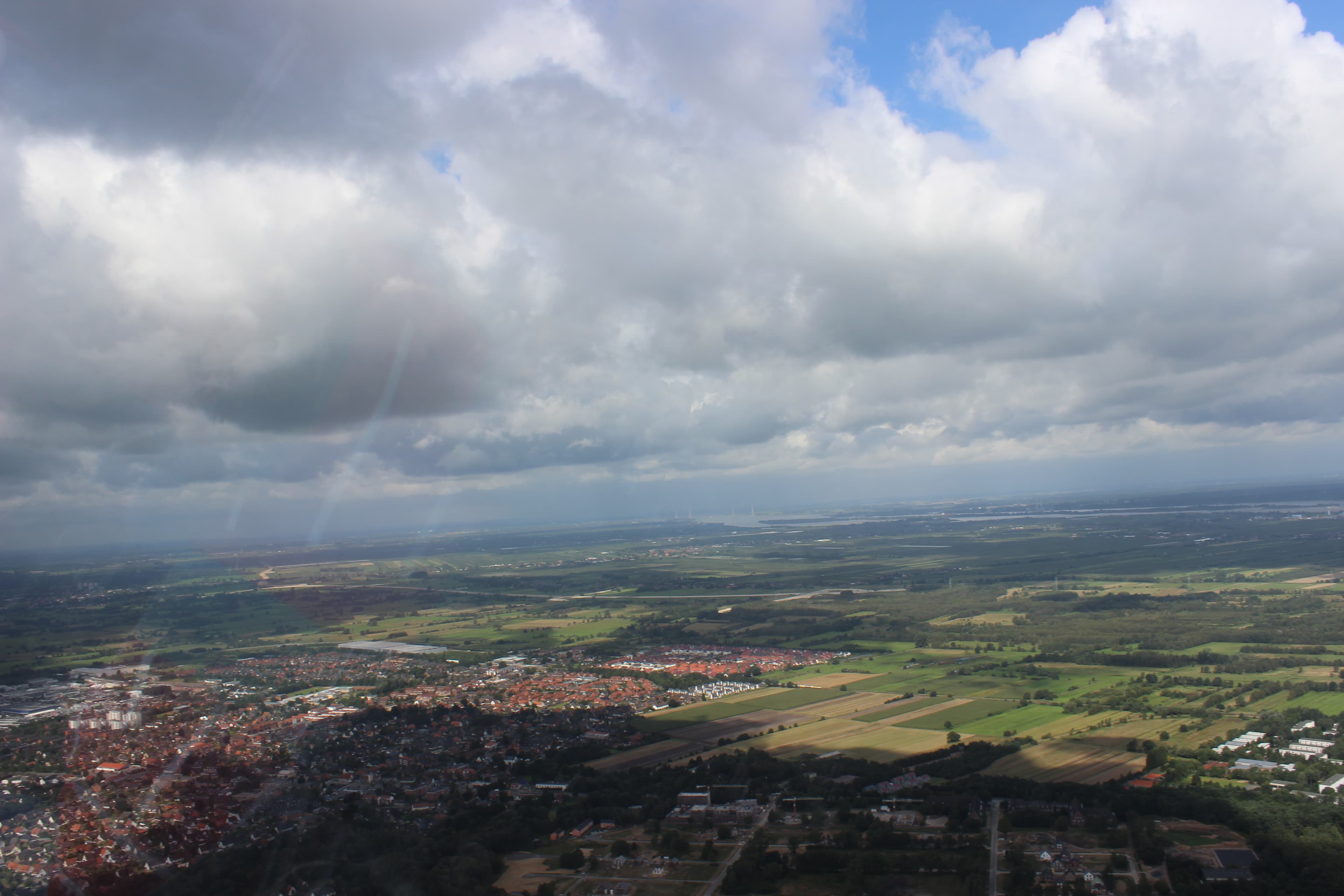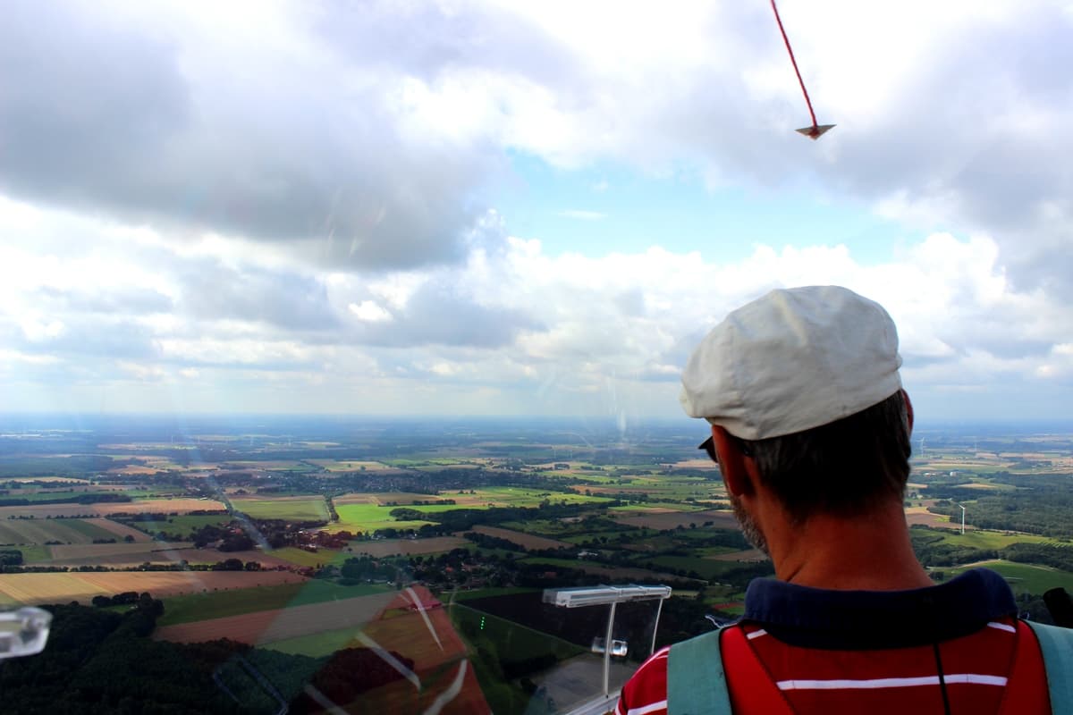 Ich bekomme ein Geschirr angelegt und steige in das kleine Flugzeug direkt hinter dem Piloten. Nun werde ich noch einmal festgeschnallt und auch der Fallschirm wird an meinem Geschirr befestigt. Ich schaffe es meine Ängste wegzuschieben und bin einfach nur gespannt. Die Haube wird geschlossen. Ein Helfer gibt das Bereit-Zeichen an den weiteren Helfer. Dieser wiederrum gibt dem Flugleiter an der Winde per Telefon das Startzeichen. Und dann geht es auch schon los. Ein Ruck am Seil und zack: es geht schnell und steil nach oben aber erstaunlich sanft. Es kribbel und fühlt sich gut an. Das Seil wird losgelassen und wir segeln durch die Lüfte. Der Pilot sagt, es sei heute ziemlich windig. Man hört die Windgeräusche und mehr nicht. Es ist wundervoll ohne Motoreinwirkung so durch die Luft zu gleiten. Und ich fühle mich seltsamer Weise sicher. Ich sehe die Fischbeker Heide, den Wald und die Elbe und Hamburg.