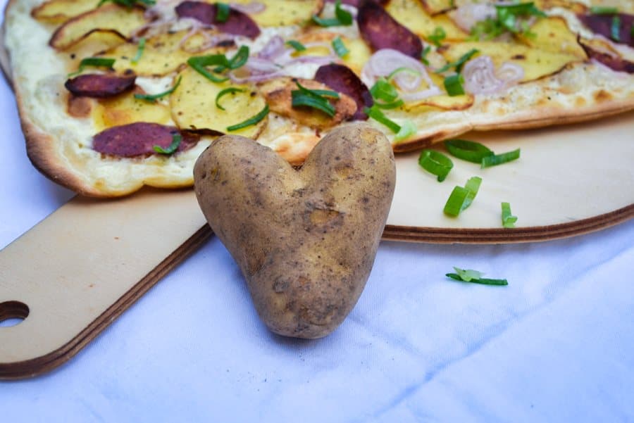 Ein besonders würziger Flammkuchen dank Heidschnuckensalami und feinen Kartoffelscheiben.