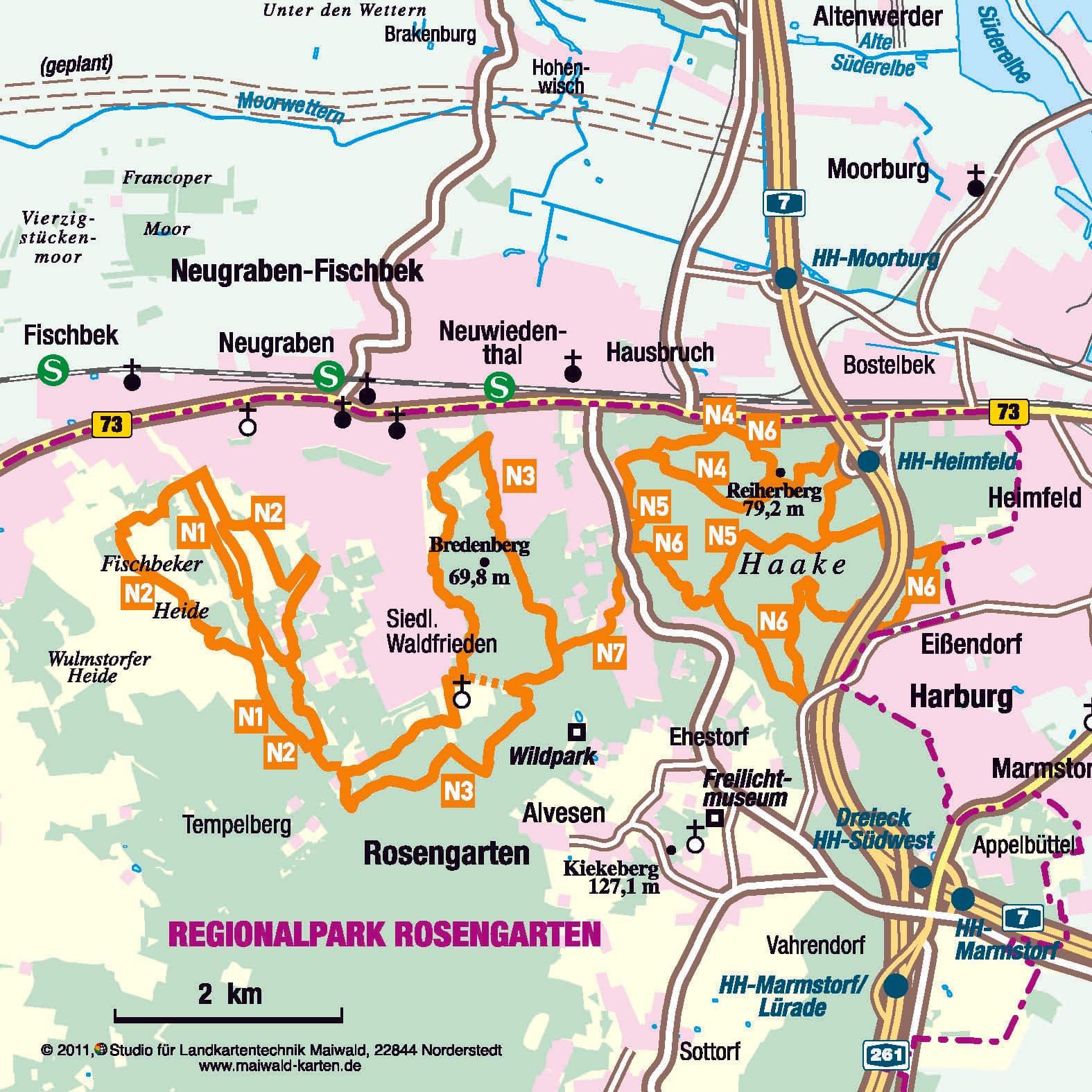 Je drei Touren mit unterschiedlichen konditionellen Anforderungen führen durch die waldreichen Hügel der Haake und durch die Neugrabener und Fischbeker Heide. Über eine Verbindungsstrecke können die Touren in der Heide und in der Haake miteinander kombiniert werden.