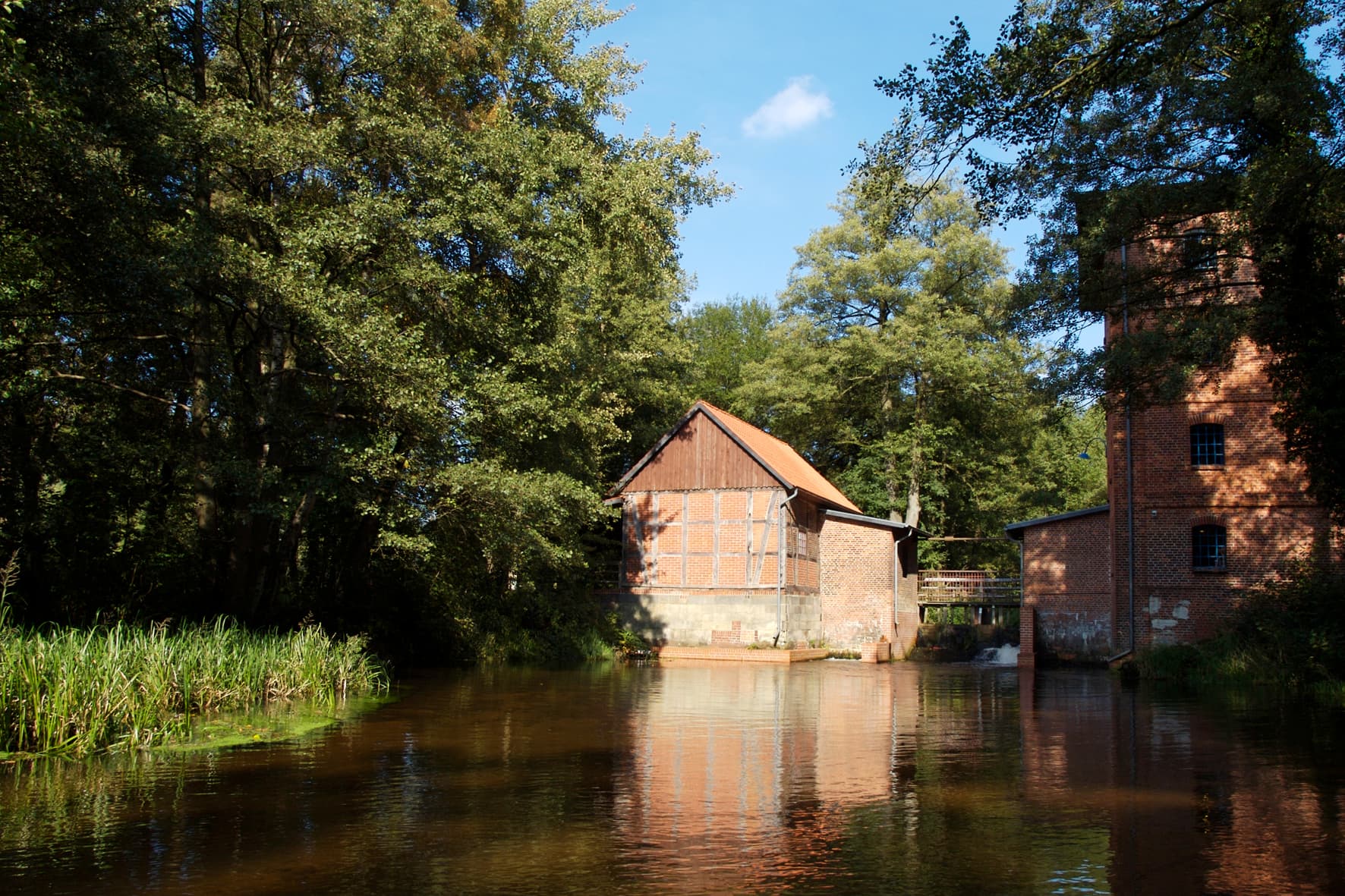 Vom See aus sieht man schon die historische Wassermühle, für mich eins der schönsten Gebäude in Müden. Erbaut 1435-1438 im Stil eines Niedersächsischen Bauernhauses erhielt sie ihr heutiges Aussehen, 1913 wurden die Wasserräder entfernt und durch Turbinen ersetzt. Jetzt befindet sich dort eine Tourist Information, eine Bücherei, ein Trauzimmer und ein Austellungsraum. Außerdem sind hier noch öffentliche Toiletten. Diese können während der Öffnungszeiten der Touristinfo genutzt werden.