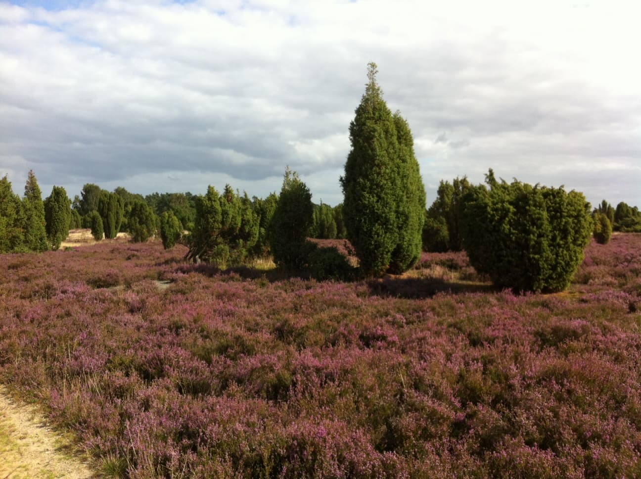 Antworten auf diese und viele weitere Fragen erhalten Sie auf einer geführten Wanderung durch die Lüneburger Heide. Anfang September 2012 hatte ich, als neue Praktikantin der Lüneburger Heide GmbH, die Gelegenheit, einen Journalisten aus den Niederlanden auf einer Erkundungstour durch die Lüneburger Heide zu begleiten. Wir schlossen uns der öffentlichen Gästeführung „Lüneburger Heide zum Kennen lernen“ ab Undeloh an und begannen unsere Wanderung mit einer Gruppe von etwa 20 Personen – allen voran unser ortskundiger Guide Herr Müller. Bereits in Undeloh wusste er eine Menge über den kleinen geschichtsträchtigen Ort zu erzählen. So erfuhren wir, dass der Name Undeloh aus dem Römisch-Langobardischen stammt und so viel wie „Quelle im Eichenhain“ bedeutet. Der Quelle kam dabei vor vielen Jahren eine bedeutende Rolle zu, denn zu den Besonderheiten Undelohs zählt unter anderem der Hungerteich, auch Hungerpohl genannt. Dieser war aufgrund eines ganz besonderen Phänomens für die Bevölkerung bis Ende des 19. Jahrhunderts von größter Bedeutung: Wenn eine Dürre bevorstand, stieg sein Pegel und er überschwemmte teilweise sogar das Tal, während er vor einer feuchten Periode besonders wenig Wasser führte. So kamen auch aus ferneren Gegenden regelmäßig Menschen, um den Pegelstand zu prüfen und herauszufinden, wie sich das folgende Jahr entwickeln würde. Heute ist dieses spannende Phänomen nicht mehr zu beobachten.