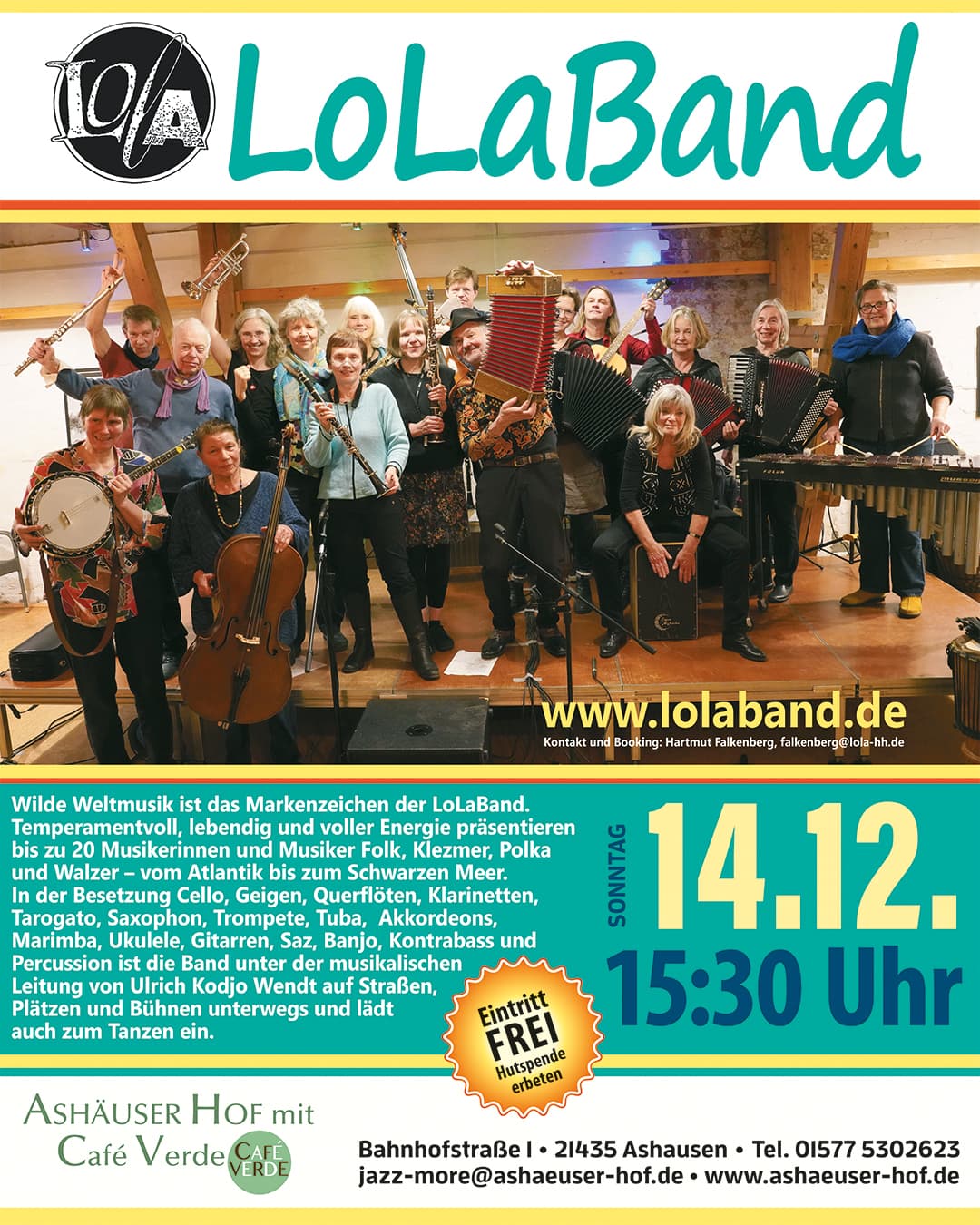 Stelle-Wilde Weltmusik ist das Markenzeichen der LoLaBand, temperamentvoll, lebendig und voller Energie präsentieren bis zu 20 Musikerinnen und Musiker Folk, Klezmer, Polka und Walzer - vom Atlantik bis zum Schwarzen Meer.
