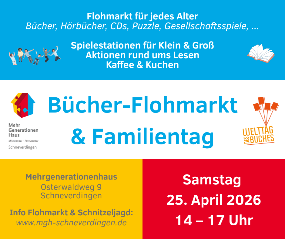 Schneverdingen-Auf dem Grundstück des Mehrgenerationenhaus dürfen sich Besucher jeden Alters auf ein buntes Fest mit geselligem Zusammensein, Angeboten und Aktionen zum Mitmachen und einem Kinder - und Erwachsenenbücherflohmarkt freuen. Für das leibliche Wohl wird vor Ort ebenfalls bestens gesorgt.