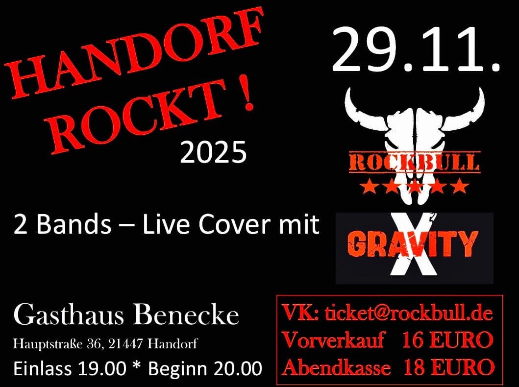 Handorf-2 Bands Live Cover Rock Konzert mit ROCKBULL und GAVITY X. Es werden Pop-Rock, Country-Rock, Classic-Rock und Hardrock Songs weltbekannter Künstler/Bands mit vielen berühmten Hits und jeder Menge Spielfreude dar geboten. Vom Ohr direkt in die Beine…Let there be Rock….! Komm zu HANDORF ROCKT ! und e…