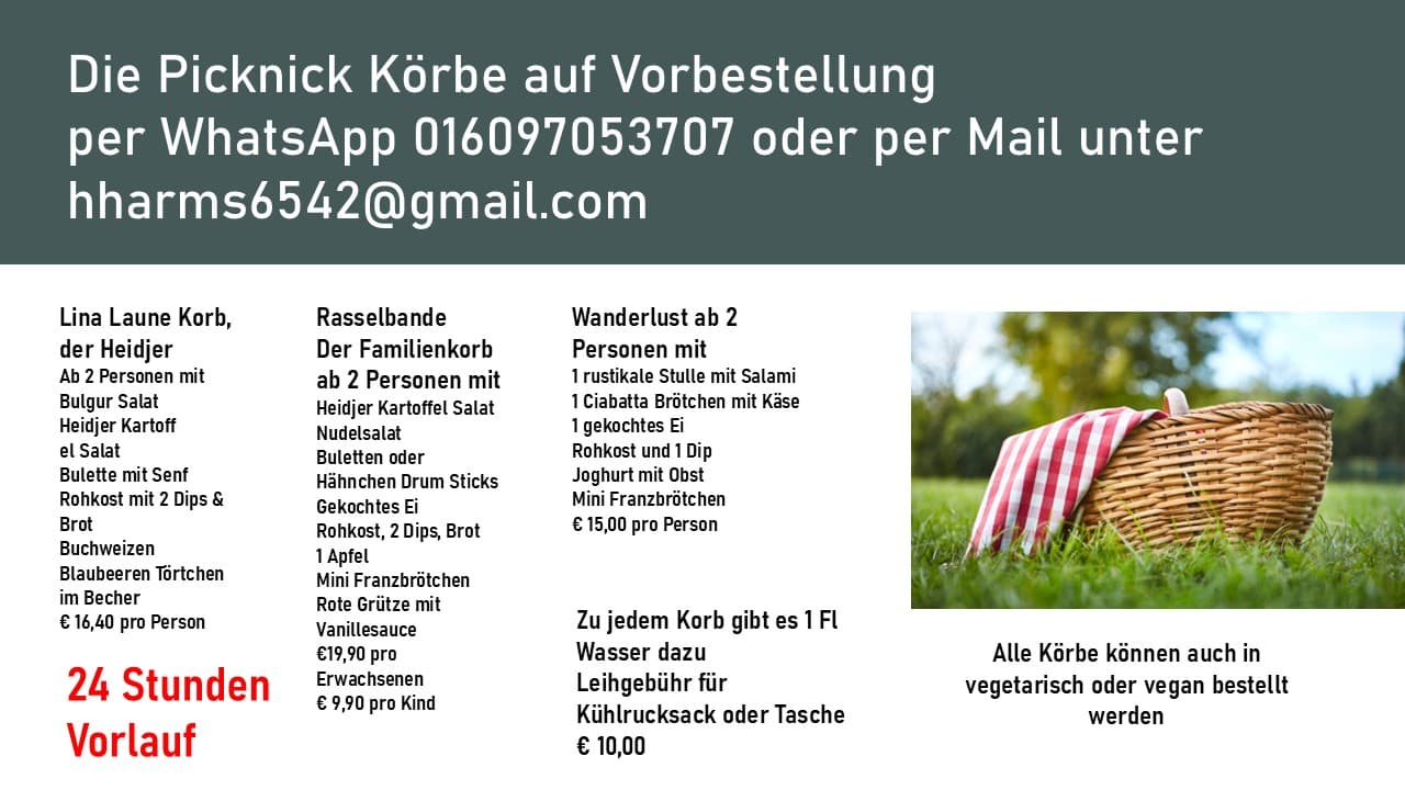 Soderstorf-Die Lüneburger Heide hat die vielzähligen Wanderwege, Eseltouren, Alpakaspaziergänge, Kanutouren und Fahrradrouten und wir haben das passende Proviant dazu. Unser Picknick-Service!