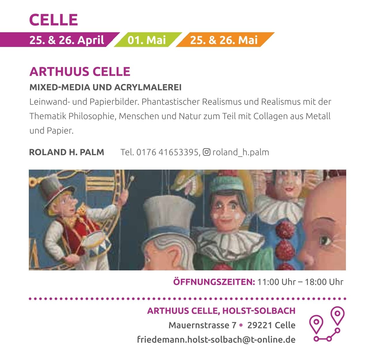 Celle-Das Arthuus Celle mit dem Gastkünstler Roland H. Palm zeigt an den beiden HeideKultour-Wochenenden 25./26. April und 1./2./3. Mai 2026 Leinwand- und Papierbilder, phantastischen realismus, Menschen und natur und Collagen aus Metall und Papier.