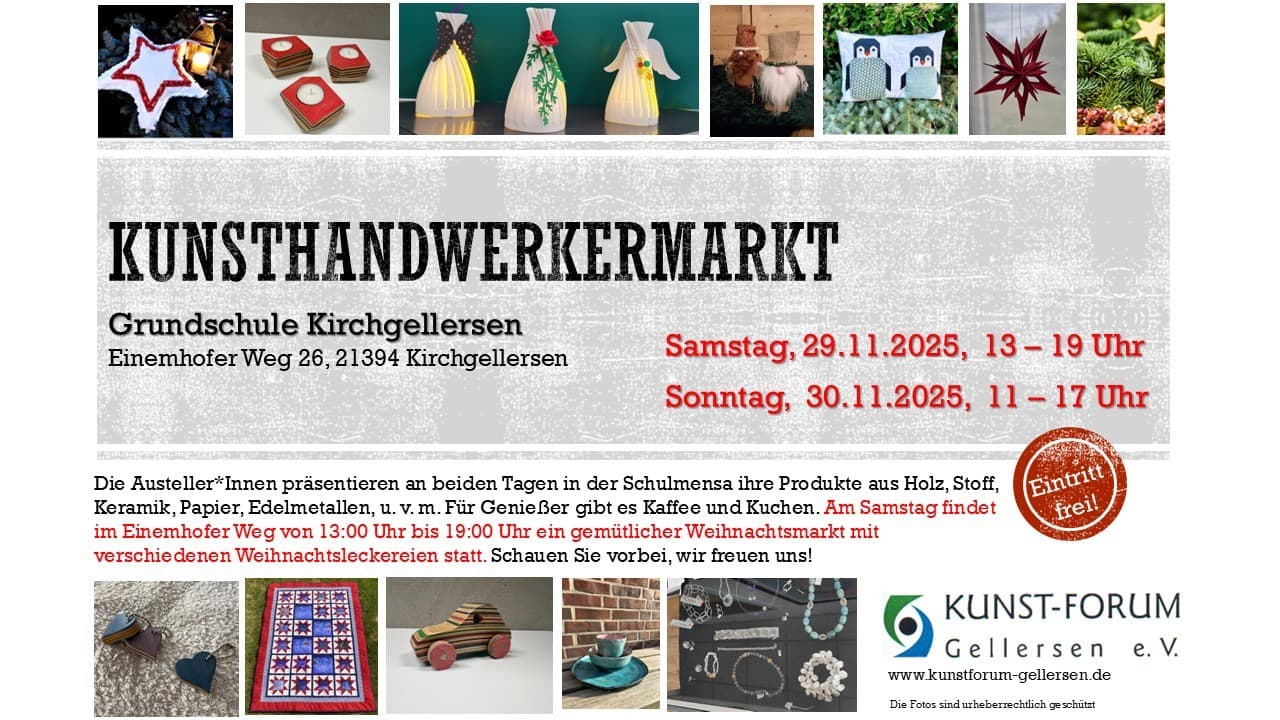 Kirchgellersen-29.11. bis 30.11. Kunsthandwerkermarkt - Grundschule Kirchgellersen, Einemhofer Weg 26, Samstag 13:00 bis 19:00 Uhr, Sonntag 11:00 bis 17:00 Uhr