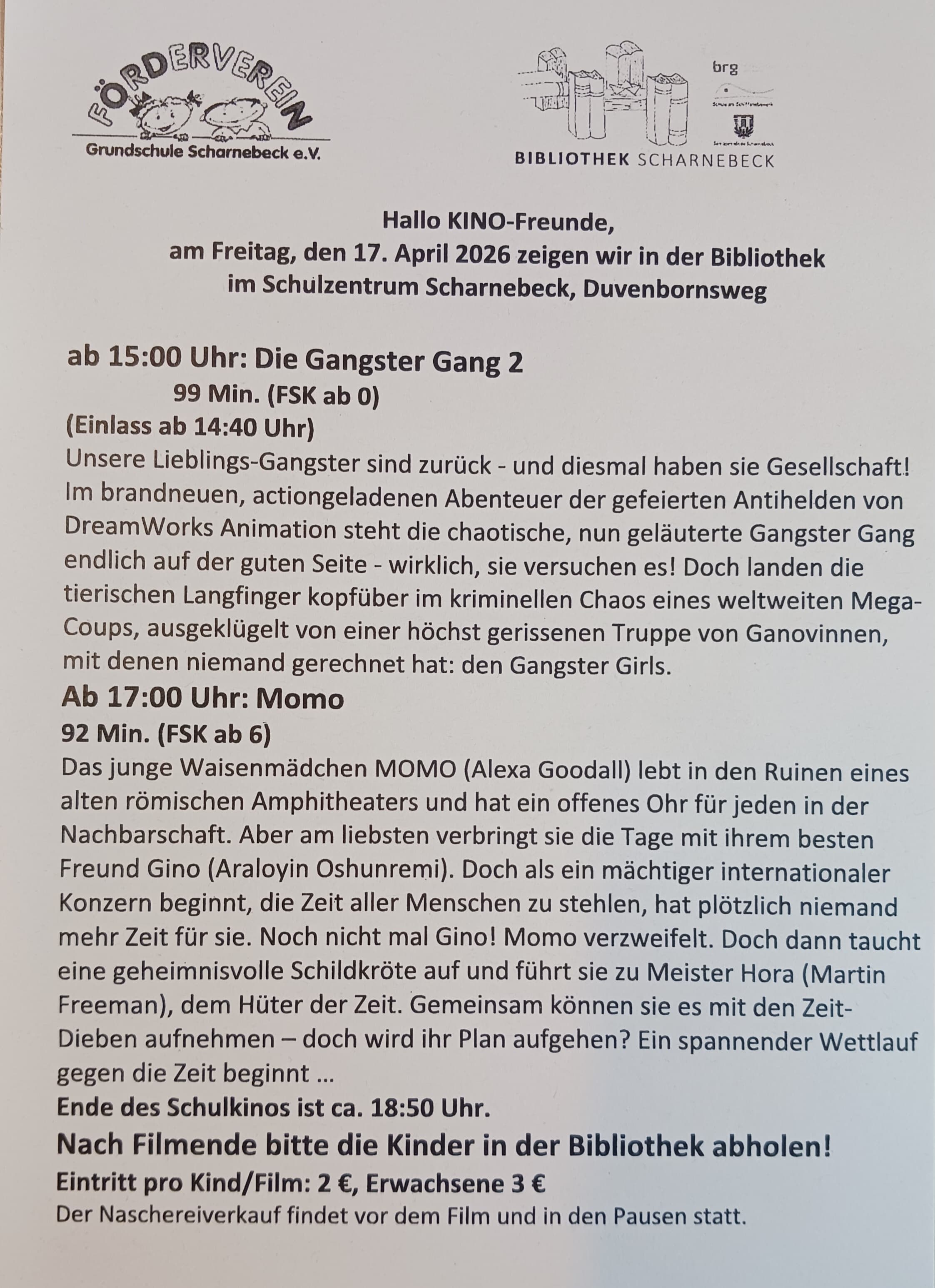 Scharnebeck-Grundschulkino Wir laden alle Grundschulkinder herzlich zu unserem Kino-Nachmittag ein!